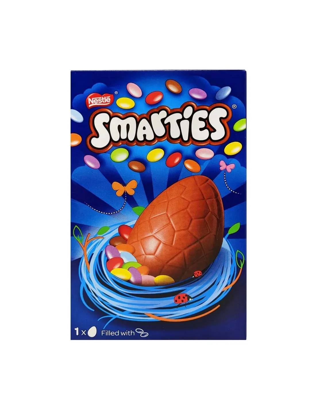 Le Smarties Egg Medium de la marque Nestlé est un œufs au chocolat au lait qui contient plusieurs Smarties à l'intérieur. Cet œuf est sans arômes, colorants ou conservateurs artificiels.