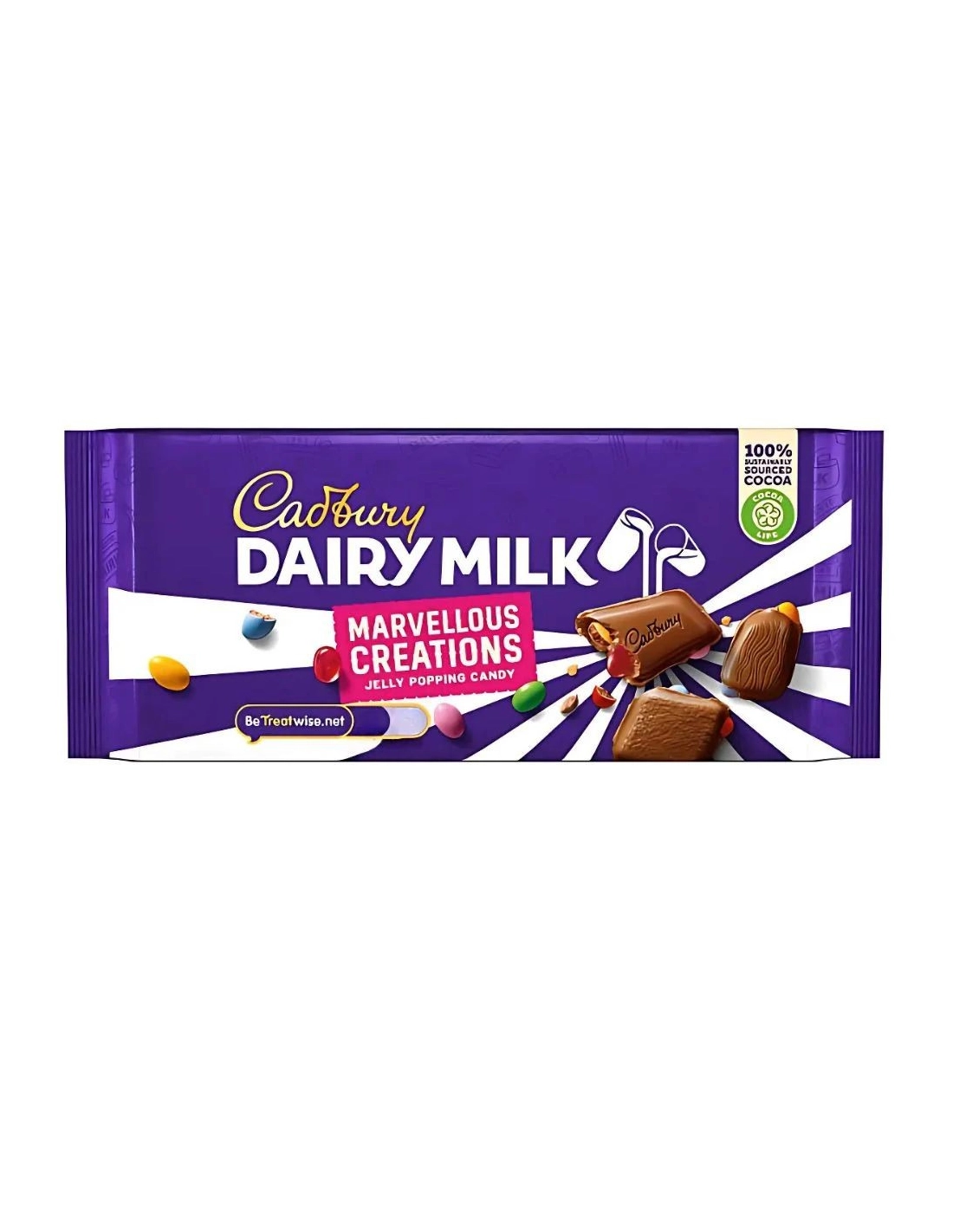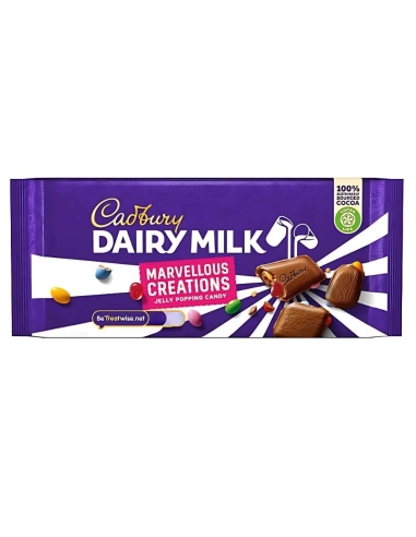 Une délicieuse tablette de chocolat Cadbury Dairy Milk Marvellous Creations Jelly Popping Candy avec des bonbons croquants à la gelée à l'intérieur. Parfait pour partager avec vos amis ou en famille, dans un emballage facile à ouvrir et à fermer.