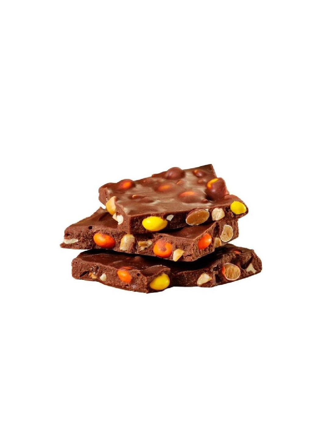 La recette est une véritable déclaration d'amour aux fans de la marque. Imaginez de grandes plaques brisées d'un chocolat au lait incroyablement velouté et fondant. Le twist magique ? Chaque morceau est généreusement parsemé de véritables Reese's Pieces (ces fameuses petites dragées colorées au cœur de beurre de cacahuète) et d'éclats fondants aux arachides.