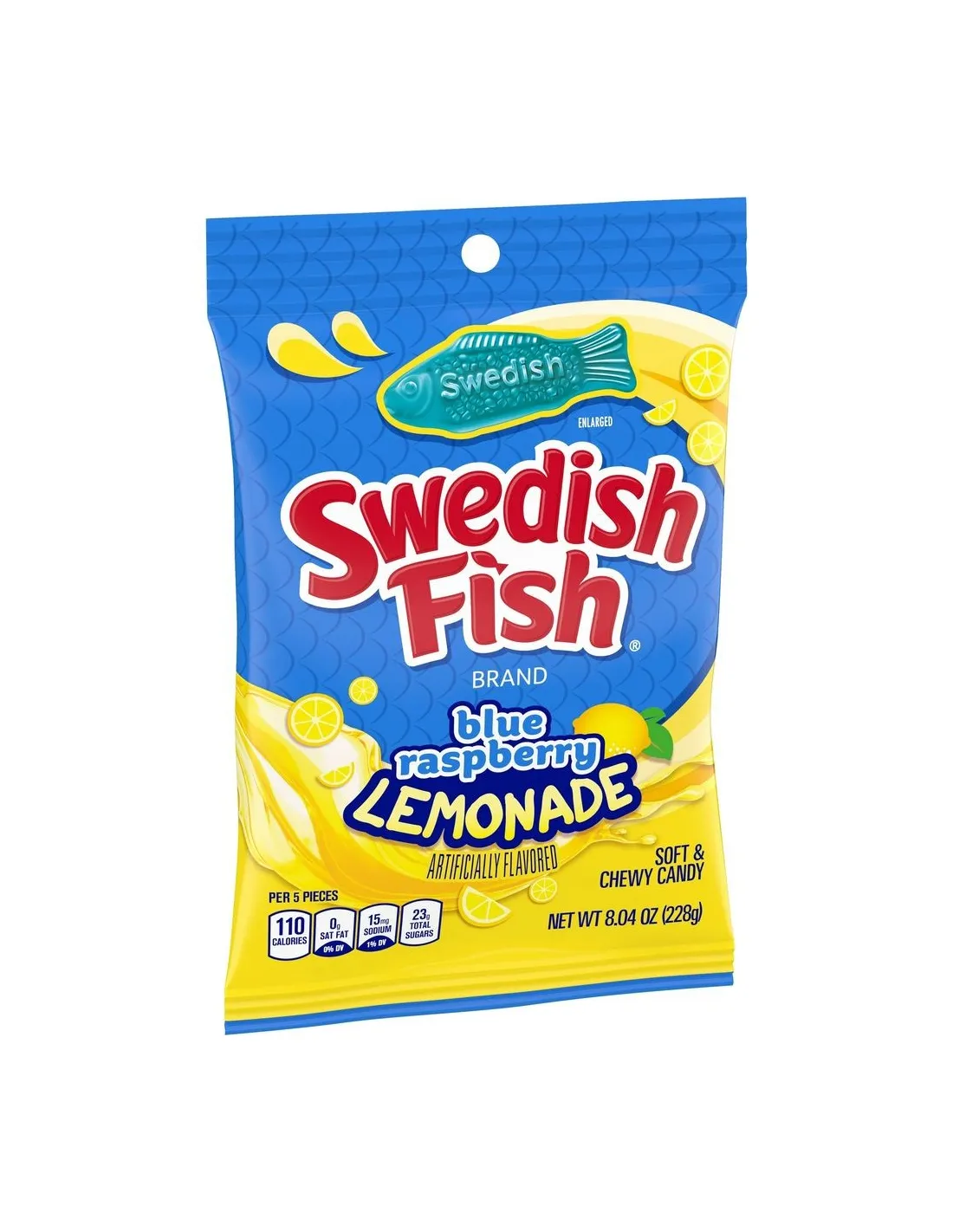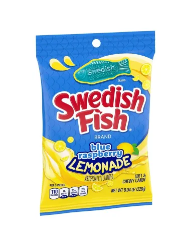 Vous connaissez surement les bonbons de la marque Swedish Fish, il est temps de vous faire découvrir cette version Blue Raspberry Lemonade. Vous retrouverez les célèbres bonbons en forme de poissons à la saveur délicieuse de la framboise bleue accompagnée d'une légère note de limonade piquante !