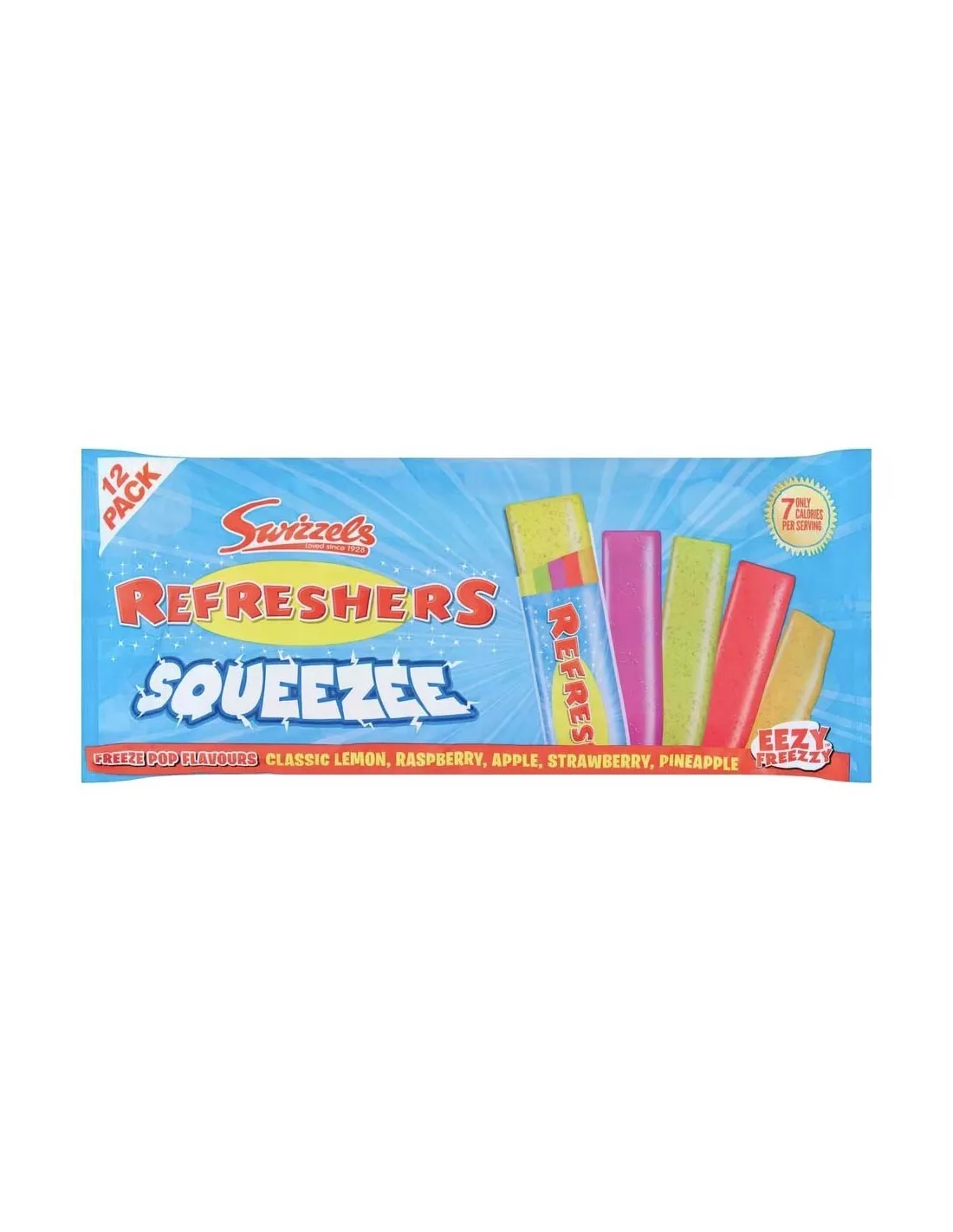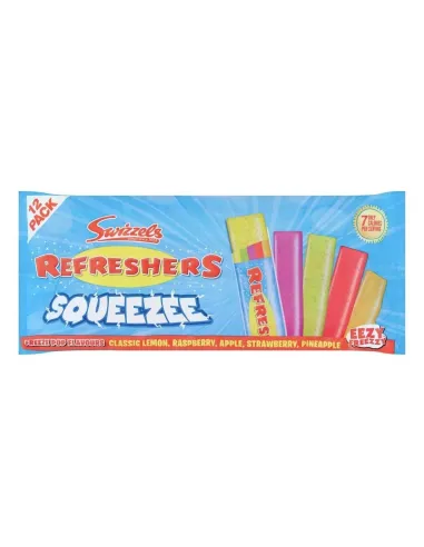 Découvrez les sucettes glacées Swizzels Refreshers Squeezee à mettre au congélateur. Vous allez adorer ces sucettes glacées aux différentes saveurs: Citron, Framboise, Pomme, Fraise et Ananas.