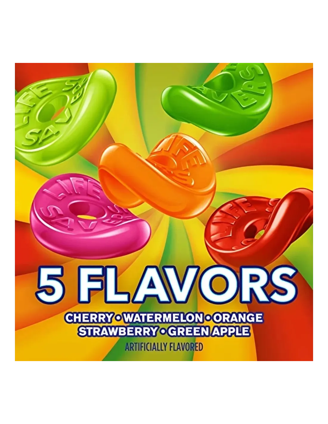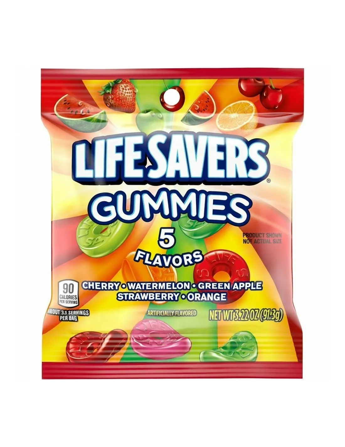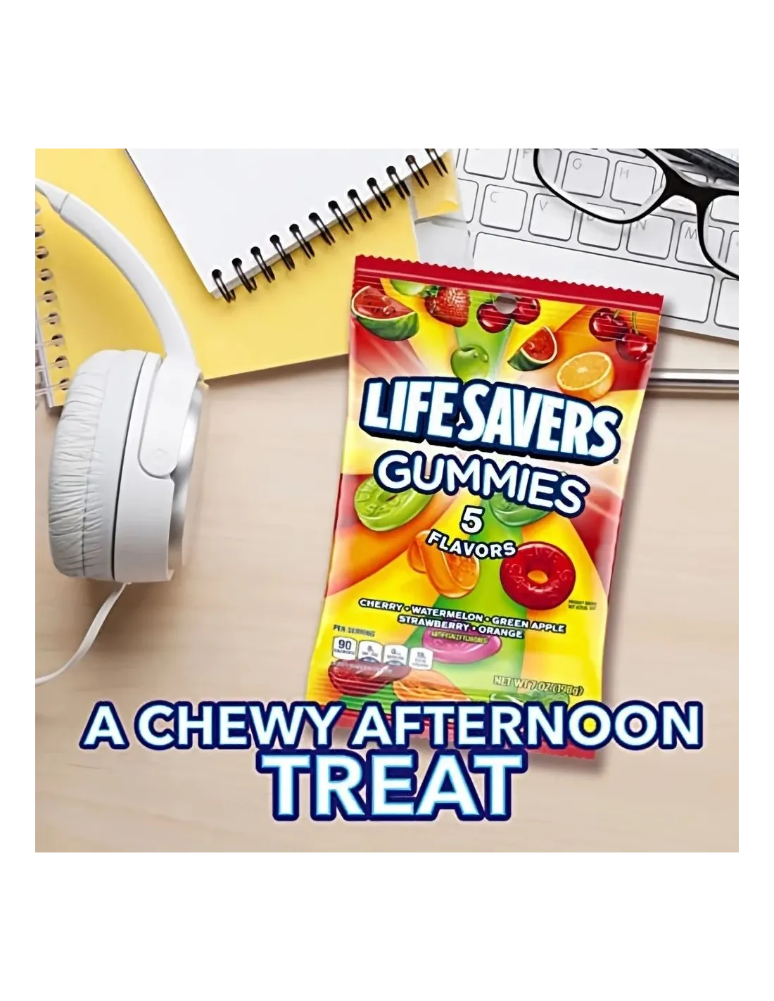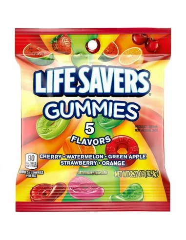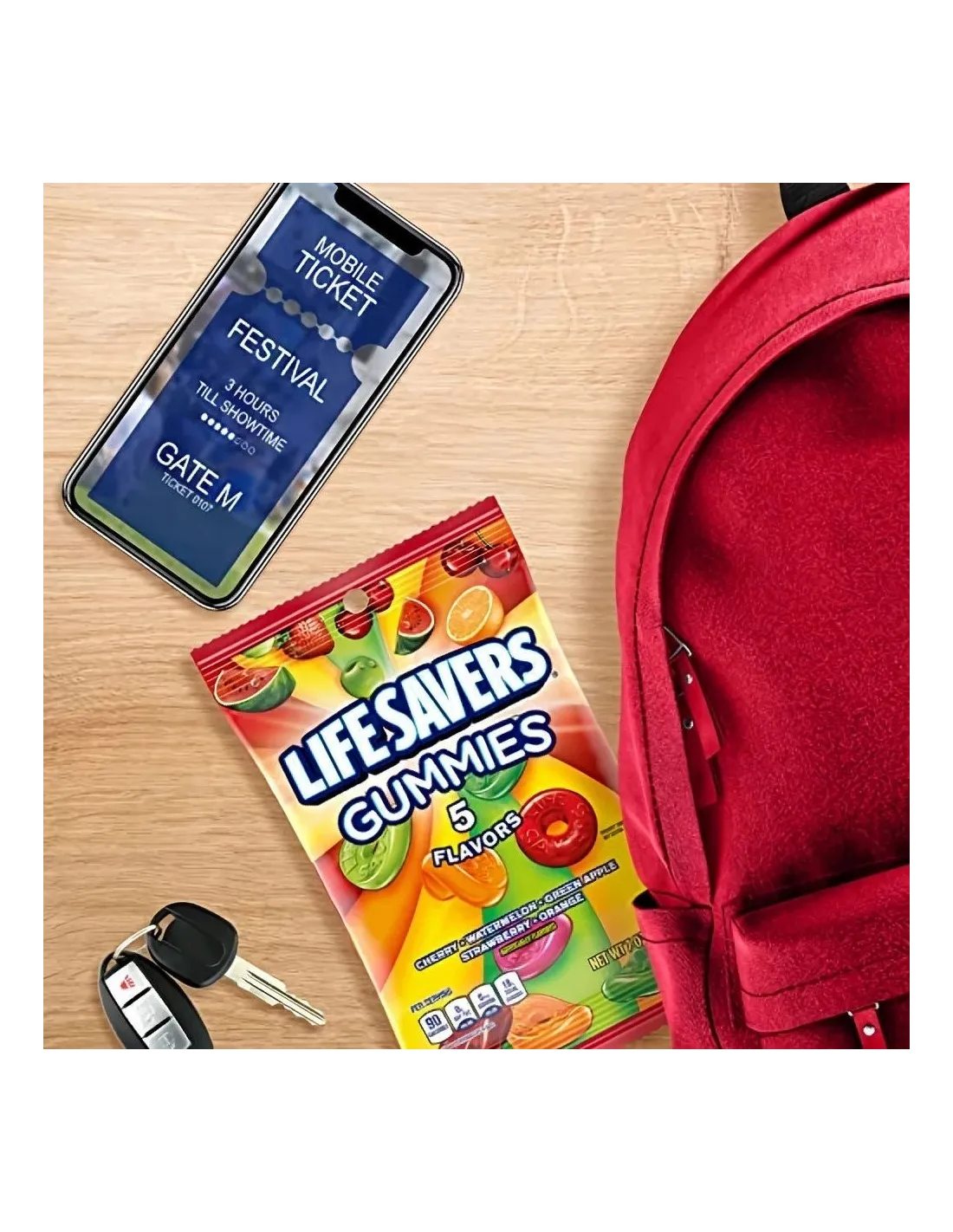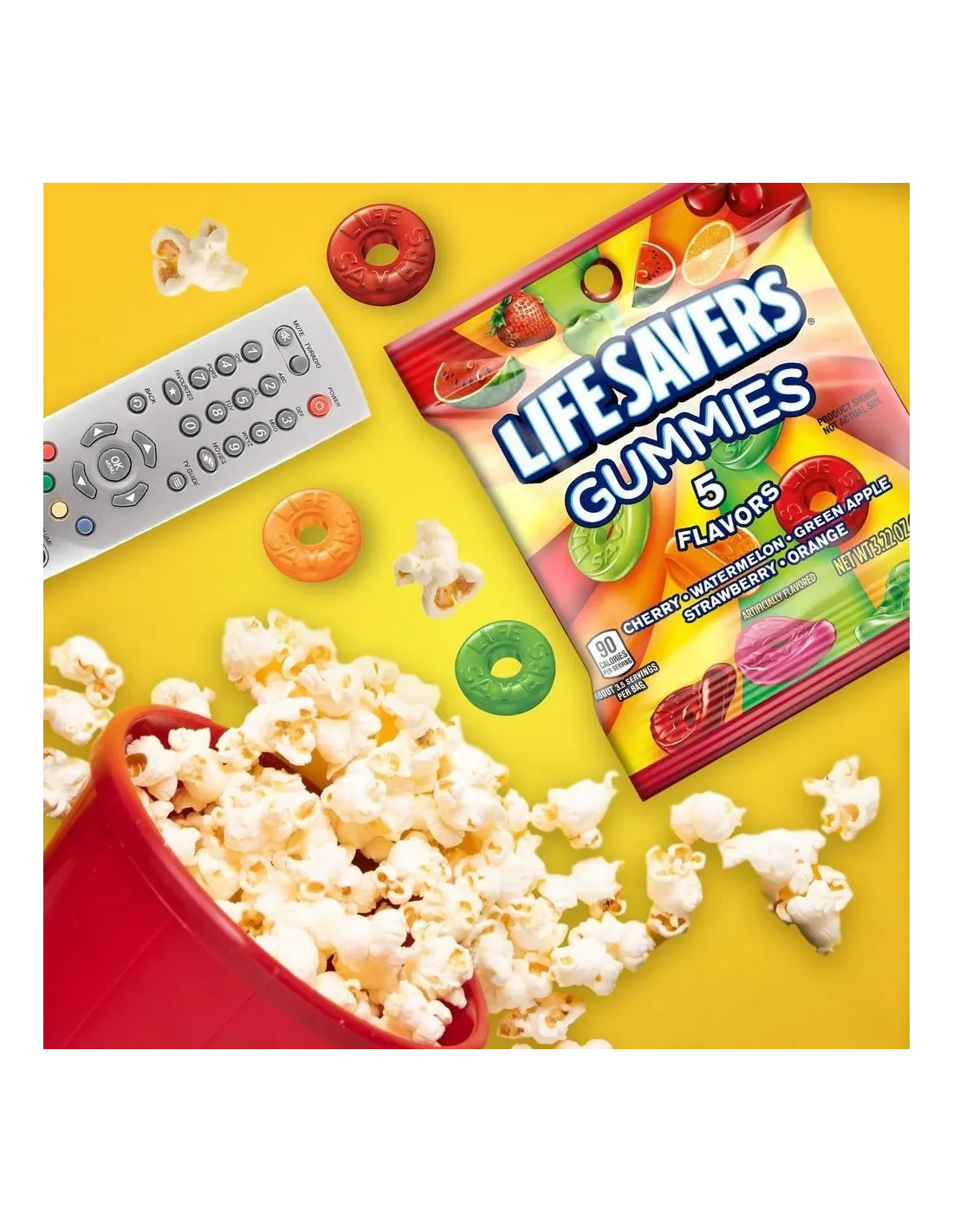 Les Life Savers Gummies 5 Flavours sont la version gummy moelleuse des célèbres bonbons américains en forme d'anneau de sauvetage. Cinq saveurs fruitées irrésistibles : cerise, pastèque, pomme verte, fraise et orange. Un classique américain doux et chewy depuis 1912.