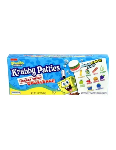 Les SpongeBob Krabby Patties Secret Menu Challenge sont des bonbons gummy en forme de Krabby Patty aux 10 saveurs mystères. Chaque burger blanc cache soit une saveur fruitée délicieuse (cerise, pomme verte, framboise bleue), soit un goût totalement inattendu (cornichon, moutarde, algue). Oserez-vous relever le défi de Bikini Bottom ?