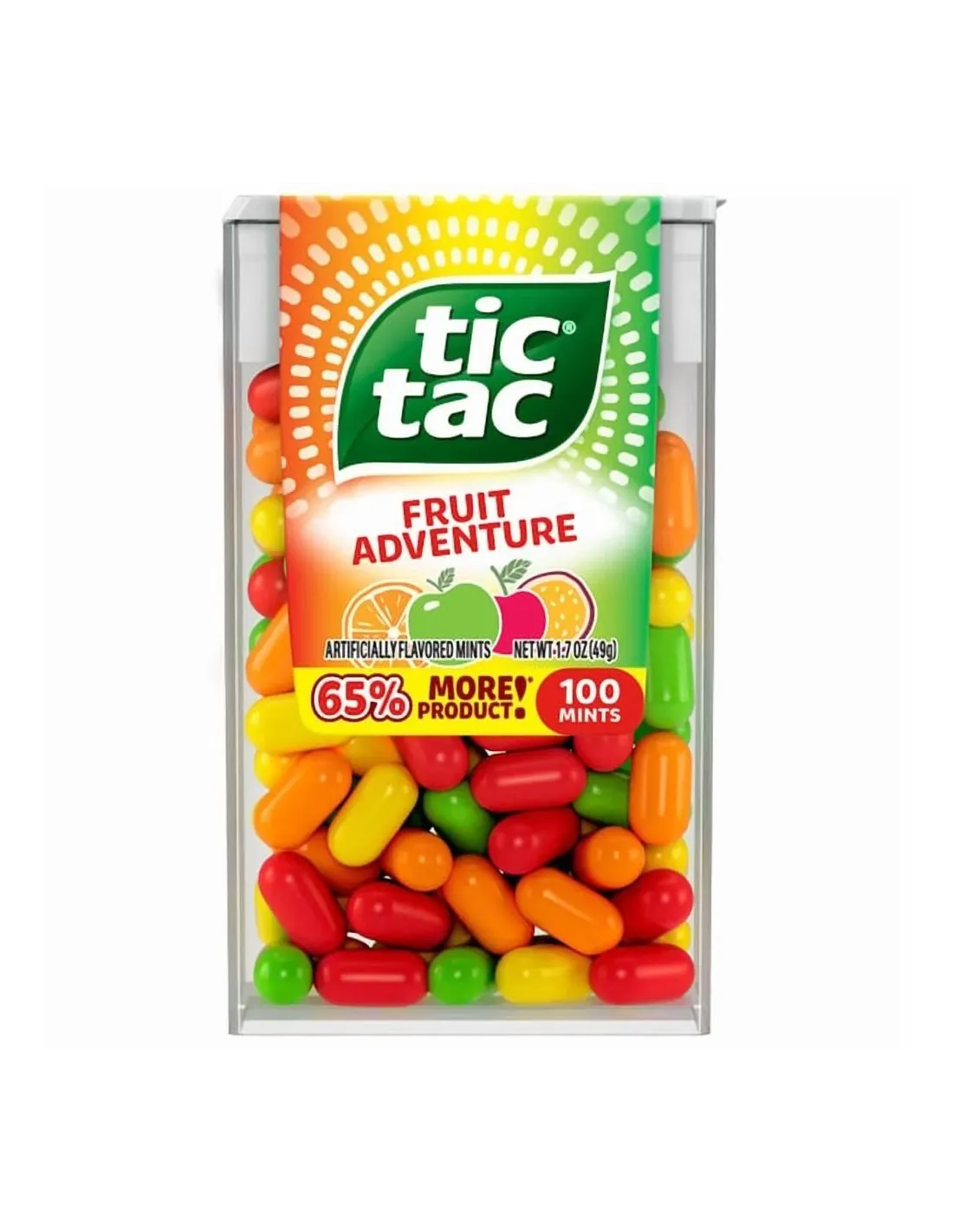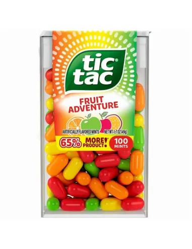 Les Tic Tac Fruit Adventure sont un mélange coloré et savoureux de pastilles aux fruits. Quatre parfums s'unissent dans chaque boîte : cerise sucrée, orange acidulée, pomme verte et fruit de la passion exotique. Une explosion fruitée en format pocket, idéale pour rafraîchir vos journées. Sans gluten et sans OGM.