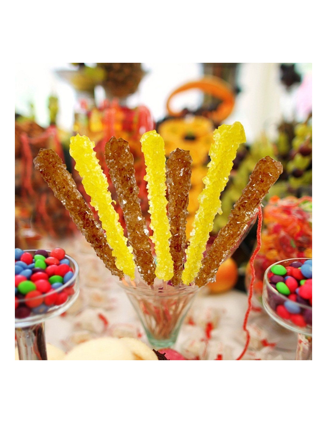 Le rock candy (sucre candi) est l'une des plus anciennes confiseries au monde, avec des origines remontant à l'Inde et la Perse du IXe siècle où il était utilisé à des fins médicinales. Aux États-Unis, il est devenu un grand classique des confiseries artisanales et un élément décoratif prisé pour les événements.