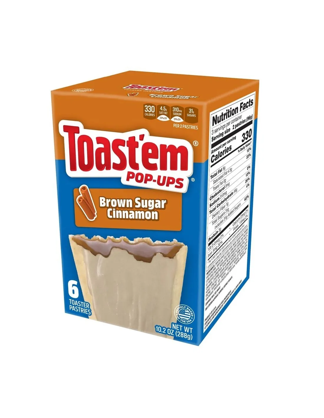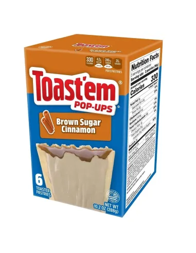 La tartelette Toast'em Pop-Ups Brown Sugar Cinnamon est un mélange de sucre roux et de cannelle recouvert d'un glaçage croquant pour une bonne dose de gourmandise. Chaque paquet contient 6 Toaster.