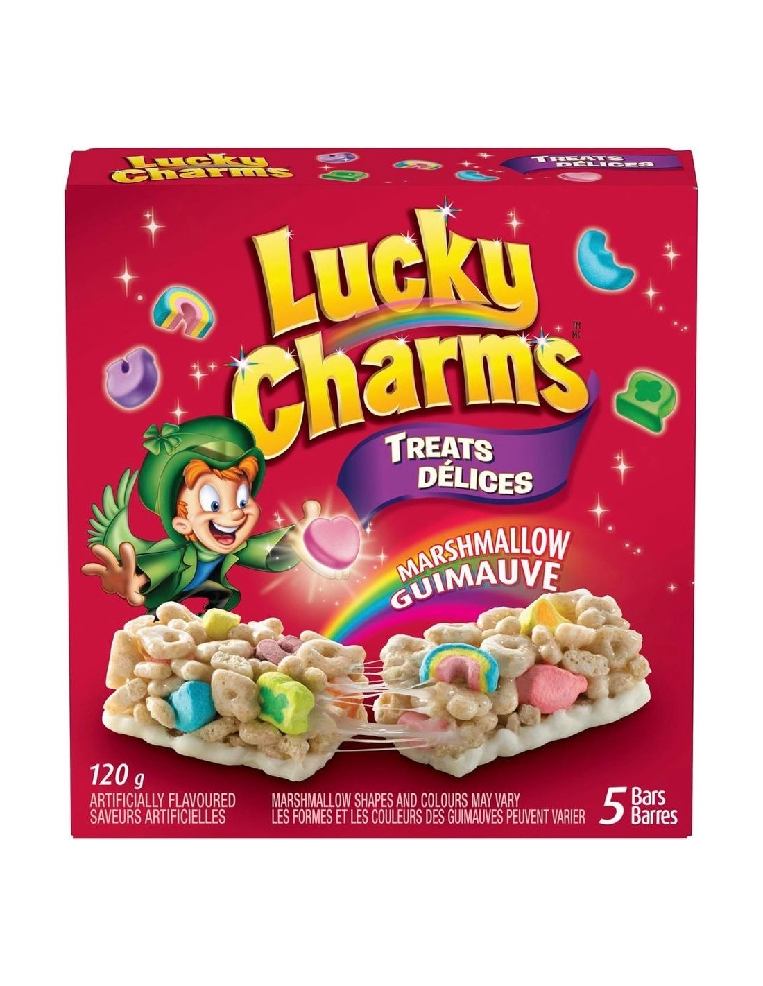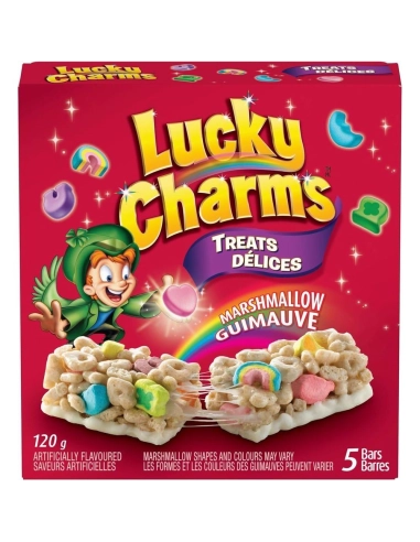 Chaque boîte contient 5 barres emballées individuellement. Vous y retrouverez la recette mythique qui a fait le succès mondial des Lucky Charms : un délicieux mélange d'avoine grillée et d'iconiques marshmallows colorés (arcs-en-ciel, licornes, trèfles, ballons rouges...), le tout lié par un généreux enrobage de guimauve fondue. Le contraste entre le croustillant des céréales et la texture "chewy" (moelleuse et élastique) de la guimauve est une véritable explosion de douceur en bouche.