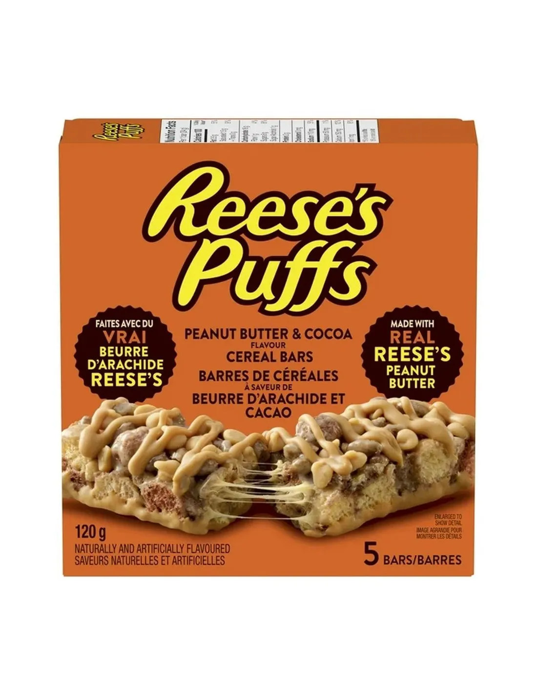 Sucres (sirop de maïs, sucre, glucose-fructose, fructose, extrait de malt d’orge), céréales Reese’s Puffs (maïs entier, sucres [sucre et/ou sucre brun], dextrose, sirop de maïs), beurre de cacahuète Reese’s (arachides, sucre, mono- et diglycérides, sel d’arachide, mélasse, amidon de maïs), farine de maïs dégermée, huiles végétales (colza et/ou tournesol à haute teneur en acide oléique), sel, cacao, phosphates de calcium, colorant : caramel (E150), phosphates de sodium, arômes naturels et artificiels, antioxydants : tocophérols, vitamines et minéraux (niacine [vitamine B3], pantothénate de calcium [vitamine B5], chlorhydrate de pyridoxine [vitamine B6], acide folique [vitamine B9]), farine de riz, chips aromatisées beurre de cacahuète Reese’s (arachides, sucre, huile de palmiste et de soja hydrogénée, extrait de sirop de maïs, dextrose, substances laitières modifiées, sel, huile de palme, arôme artificiel, lécithine de soja),