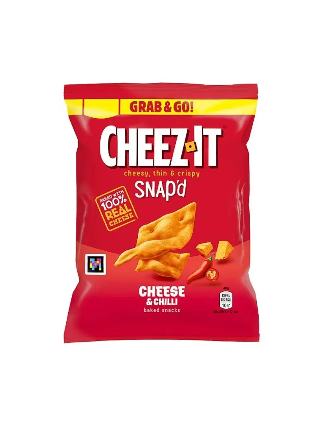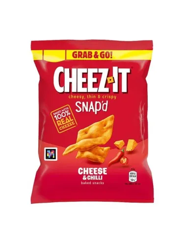 Craquez pour ce snack salé ultra gourmand :Cheez-It Snap'd Cheese & Chilli Grab & Go des chips fines, cuites au four, à base de vrai fromage, relevées par une pointe de piment épicé. Parfaites pour une pause croustillante et savoureuse à tout moment.