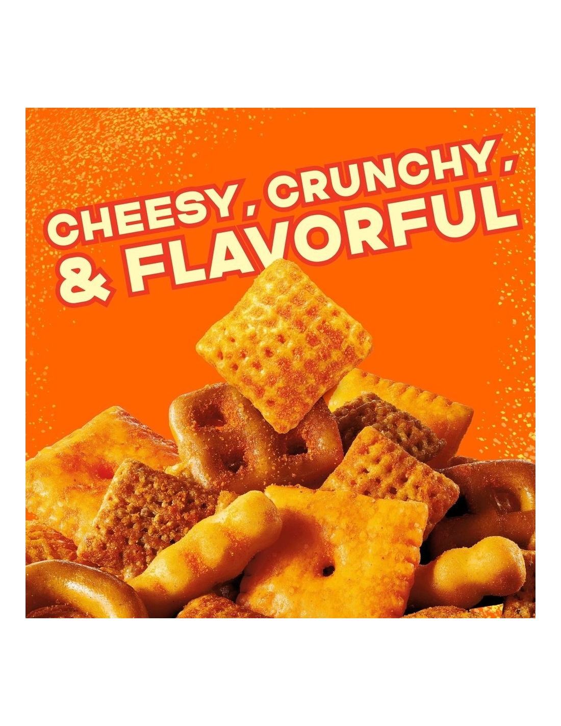 Découvrez le Chex Mix Savoury Snack Mix Cheddar (226g) : l'ultime mélange apéritif américain combinant des céréales croustillantes, des bretzels et des biscuits salés, le tout généreusement enrobé d'une irrésistible saveur au vrai fromage cheddar !