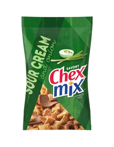 Découvrez le Chex Mix Savoury Snack Mix Sour Cream and Onion (226g) : l'ultime mélange apéritif américain combinant des céréales croustillantes, des bretzels et des biscuits salés, le tout enrobé d'une délicieuse saveur crÚme aigre et oignon !