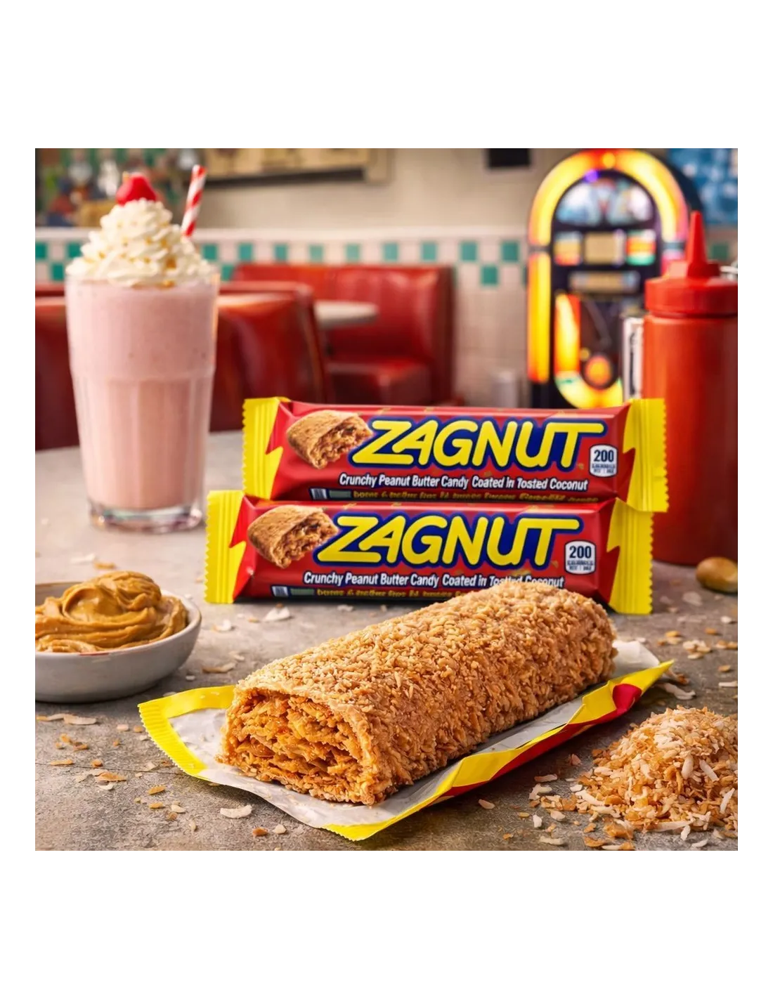 ¿Te encanta la mantequilla de cacahuete y el coco? ¡Entonces el Hershey's Zagnut es para ti! El Zagnut es una crujiente barra de chocolate con relleno de mantequilla de cacahuete, recubierta de coco rallado tostado y cubierta con una cobertura de chocolate con leche Hershey's . ¡Es un éxito de ventas en USA .!
