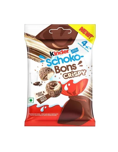 Descubre el Schoko-Bons Crispy de la marca Kinder en versión bolsillo con este formato de 22,4g que contiene 4 Schoko-Bons Crispy.