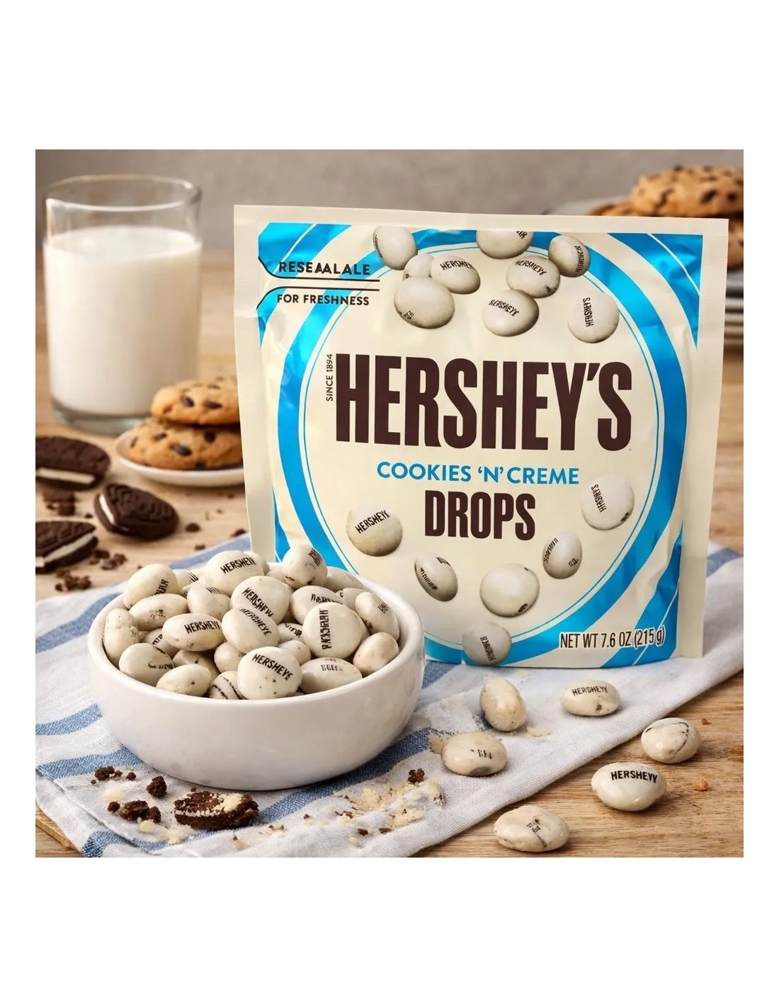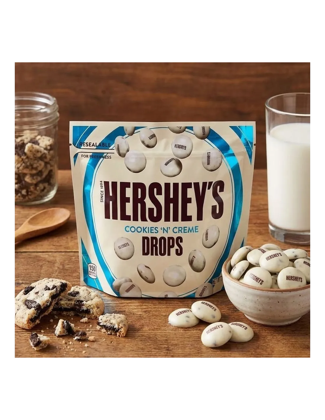 Combinación perfecta entre la cremosidad del chocolate blanco y el crujido de las galletas, descubre los caramelos DROPS COOKIES 'N' CREAM KING Size de la marca HERSHEY'S . ¡La famosa barra de chocolate también está disponible en peladillas! Fáciles de transportar, se trata de sabrosos bocados con cáscara de azúcar y decorados con crujientes trozos de galleta. Dulces y deliciosas, estas bolas de chocolate se pueden disfrutar dondequiera que estés para un descanso delicioso y derretido.