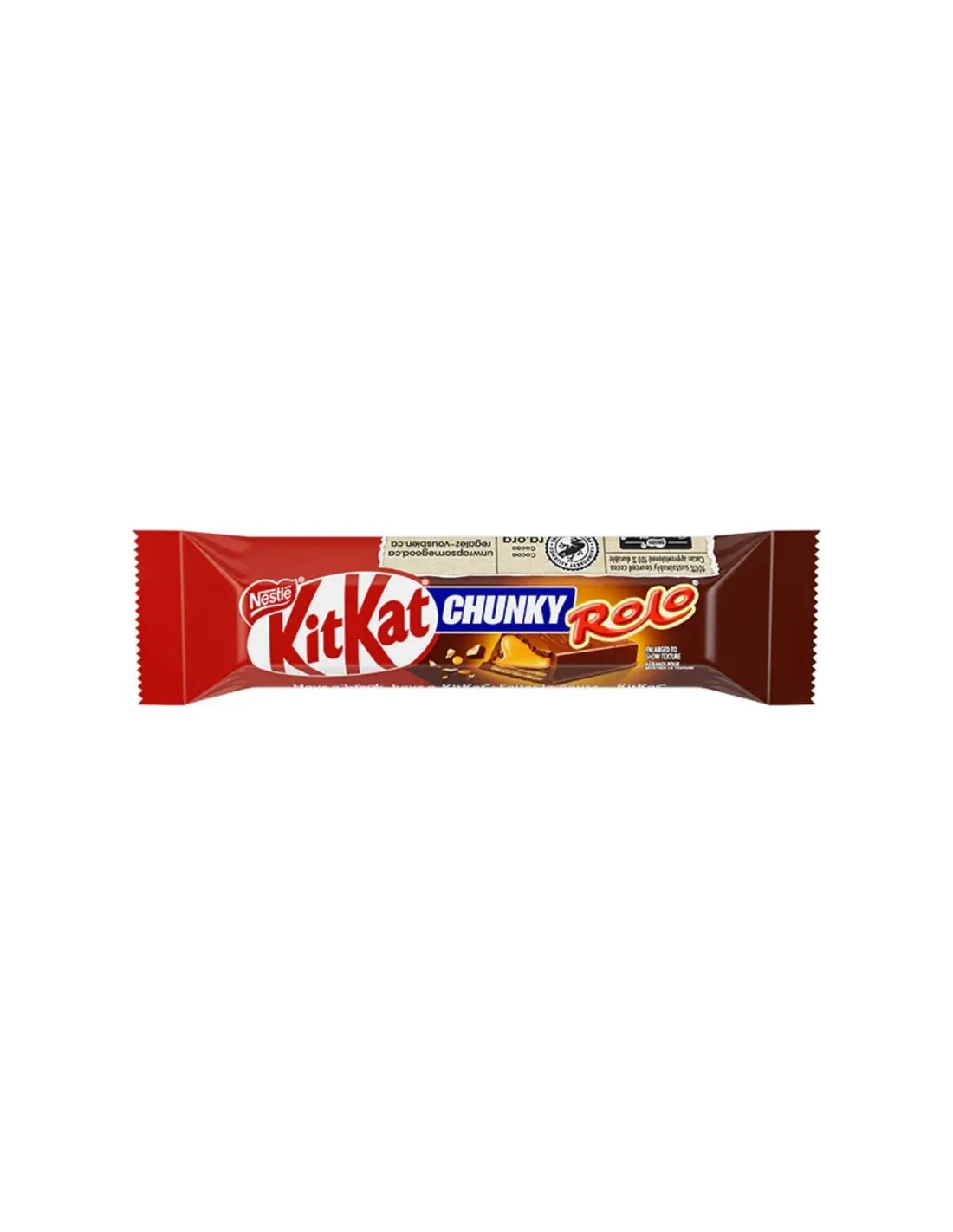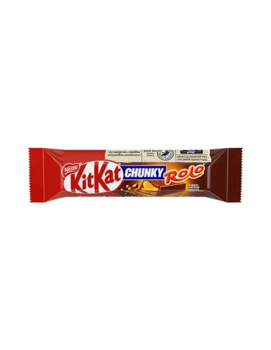 Recubiertas de delicioso y cremoso chocolate con leche, enamórate de la barra de chocolate CHUNKY Rolo de KitKat . La gama Chunky ofrece obleas aún más crujientes para un máximo placer. Elaboradas con leche y manteca de cacao, te conquistarán desde el primer bocado por la exquisita combinación de chocolate y caramelo Rolo en su interior.