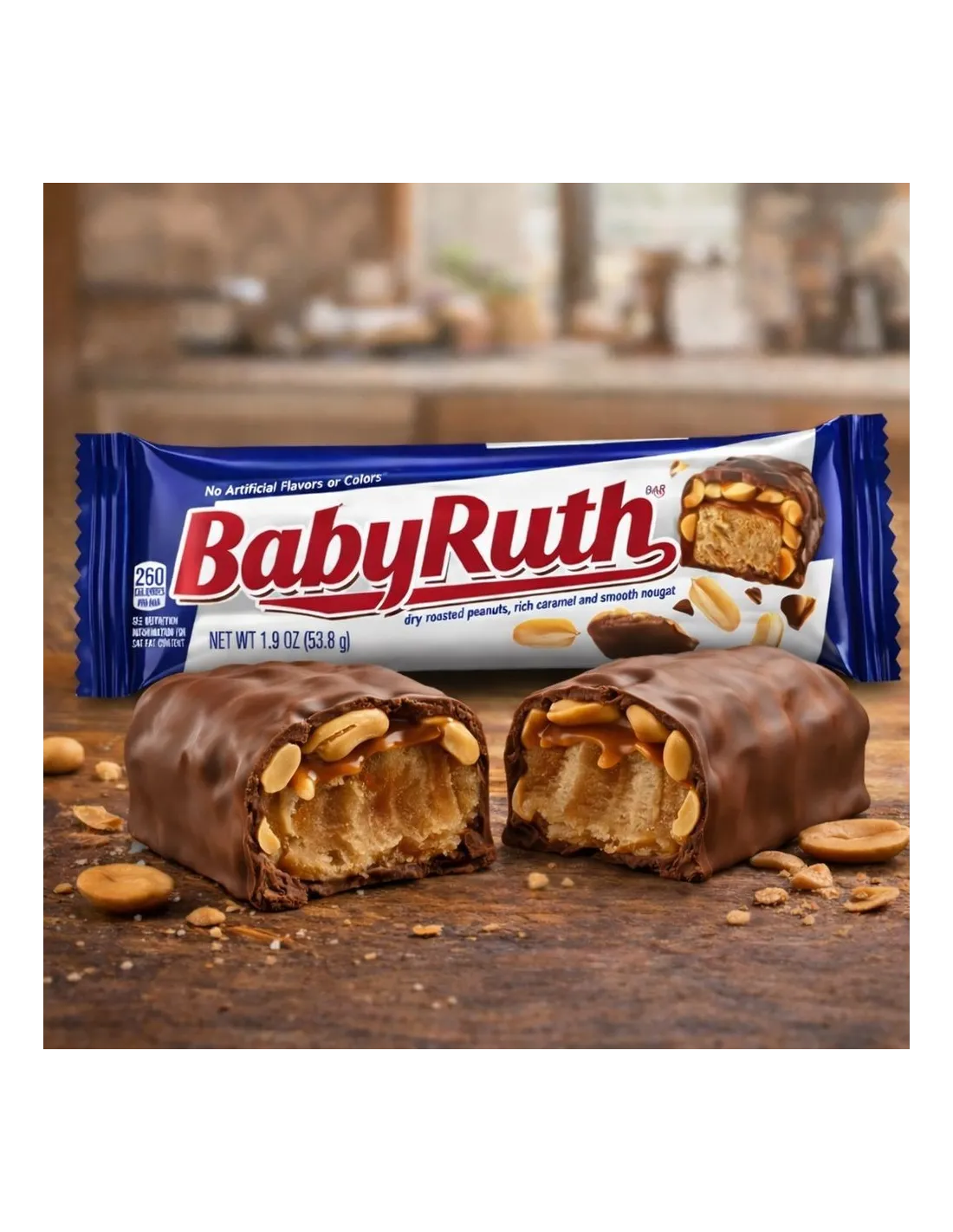 Un auténtico icono de la repostería estadounidense, la Baby Ruth es una preciada barra de chocolate que se ha disfrutado durante más de un siglo. Lanzada en Estados Unidos en la década de 1920, se ha convertido en un clásico imprescindible gracias a su equilibrio perfecto entre textura crujiente, textura que se derrite en la boca y un intenso sabor a chocolate .