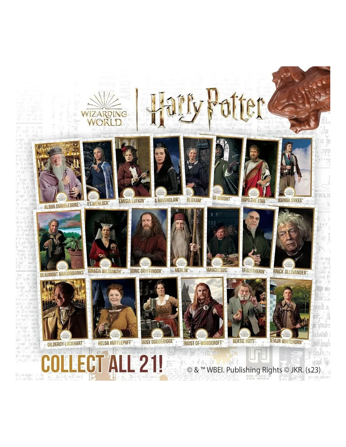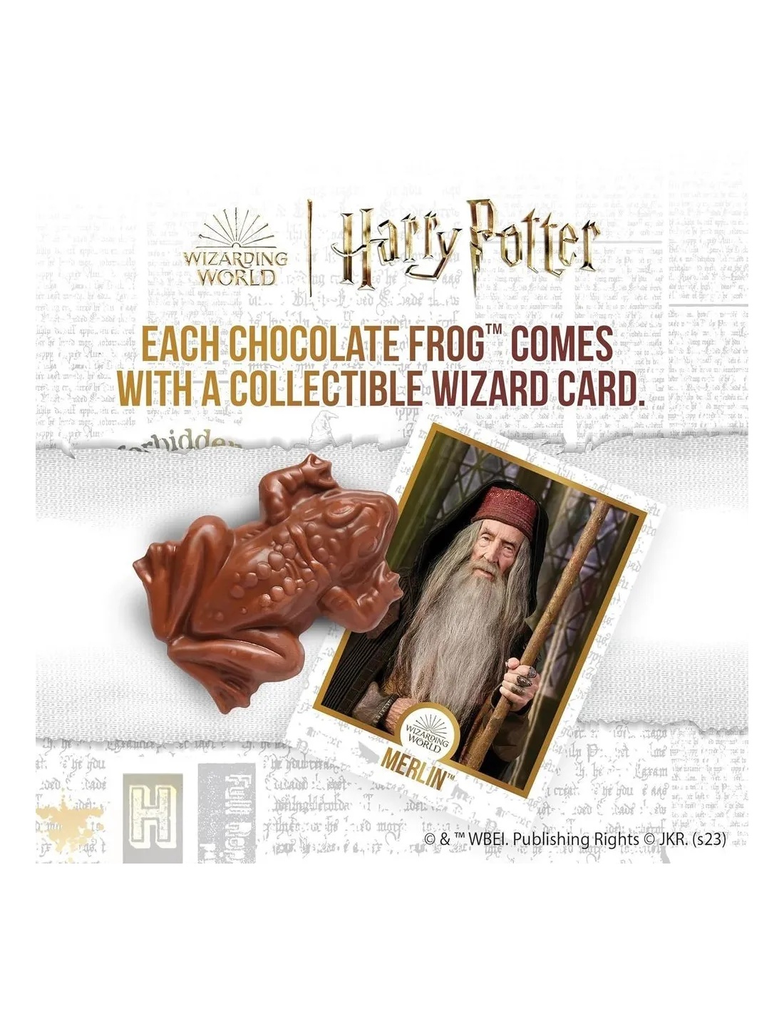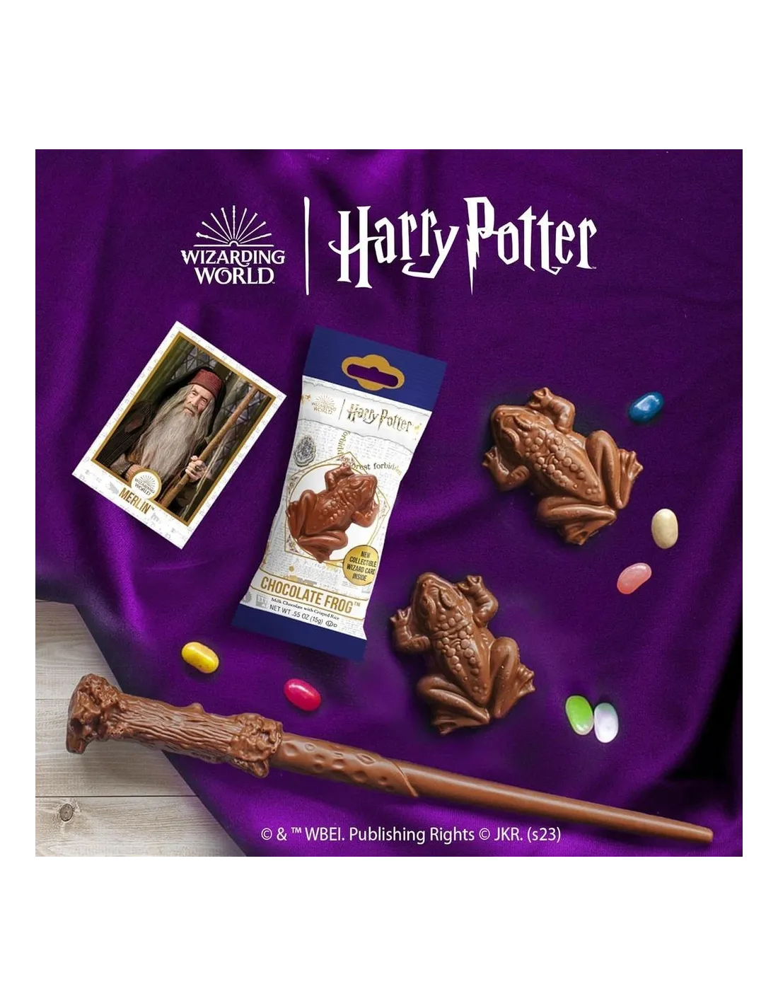 Directamente inspirado en la película y los libros de culto, este dulce es una rana de chocolate con leche crujiente, que contiene una tarjeta coleccionable de mago o bruja al azar de una gran colección (Dumbledore, McGonagall y muchos otros).