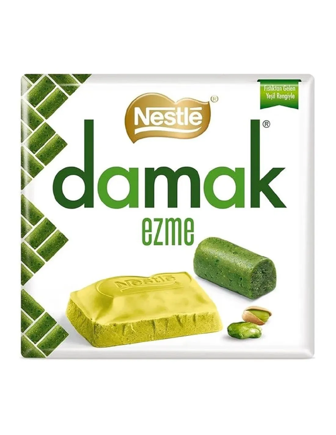 El chocolate con crema de pistacho Nestlé Damak Ezme combina un suave chocolate con leche y una aterciopelada crema de pistacho para un capricho elegante y delicioso.