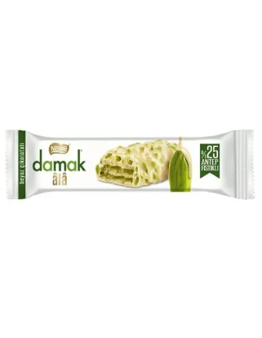 El chocolate blanco con pistacho y oblea Nestlé Damak Ala combina una oblea ligera, una suave crema de chocolate blanco y pistachos crujientes. ¡Un placer refinado!