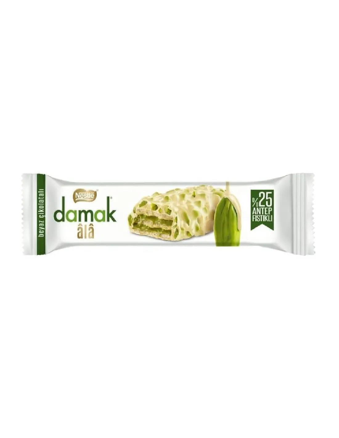 Déjate seducir por el chocolate blanco con pistacho Nestlé Damak Ala Wafer , un capricho excepcional que combina una textura crujiente con una dulzura que se derrite en la boca.
