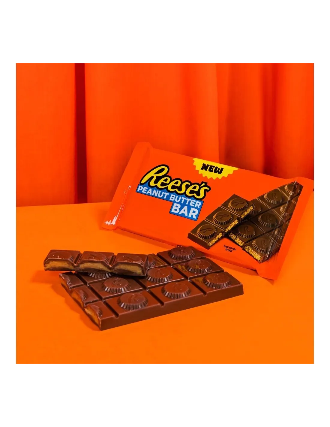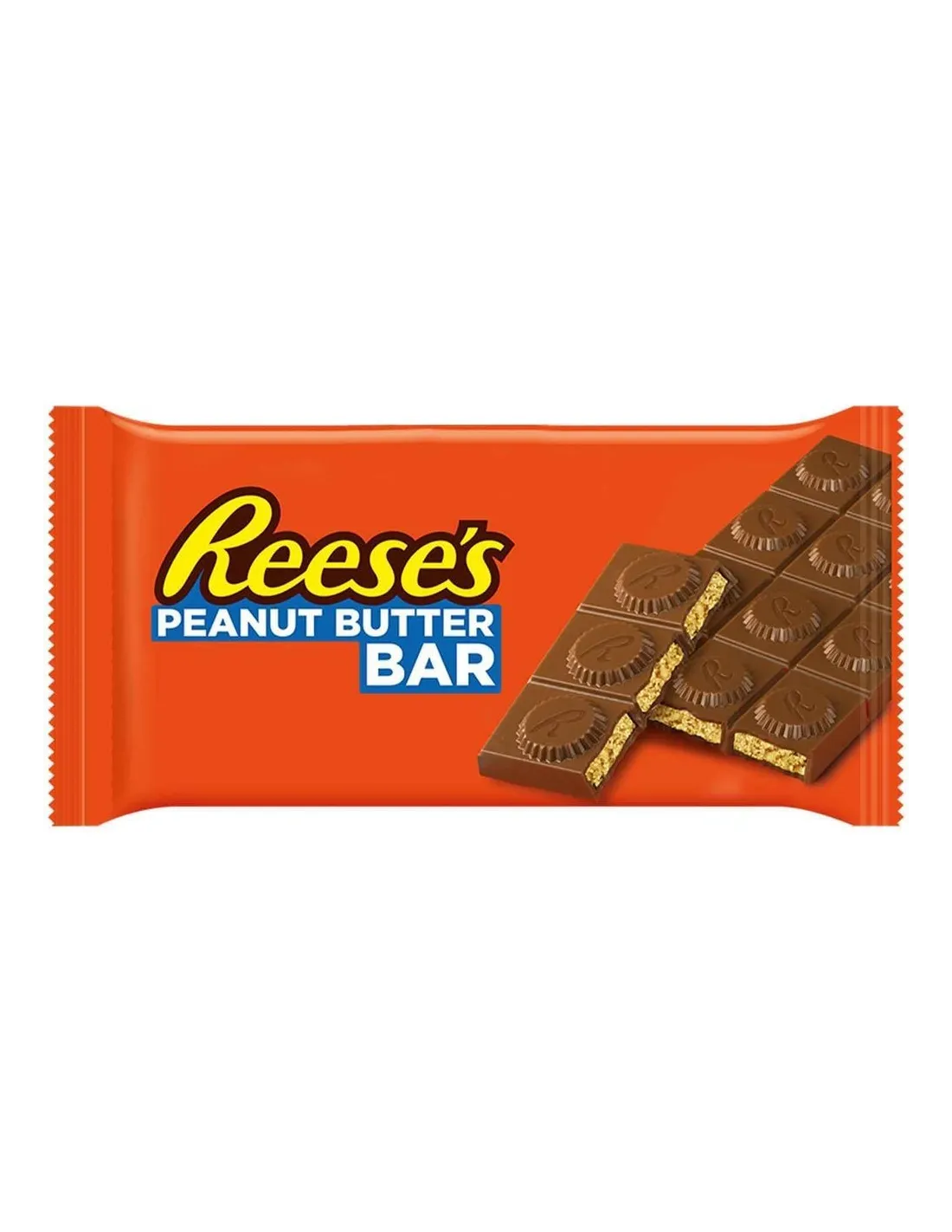 La barra de mantequilla de cacahuete Reese's combina la textura que se deshace en la boca de la mantequilla de cacahuete y el cremoso chocolate con leche para crear un capricho dulce y salado 100% americano.