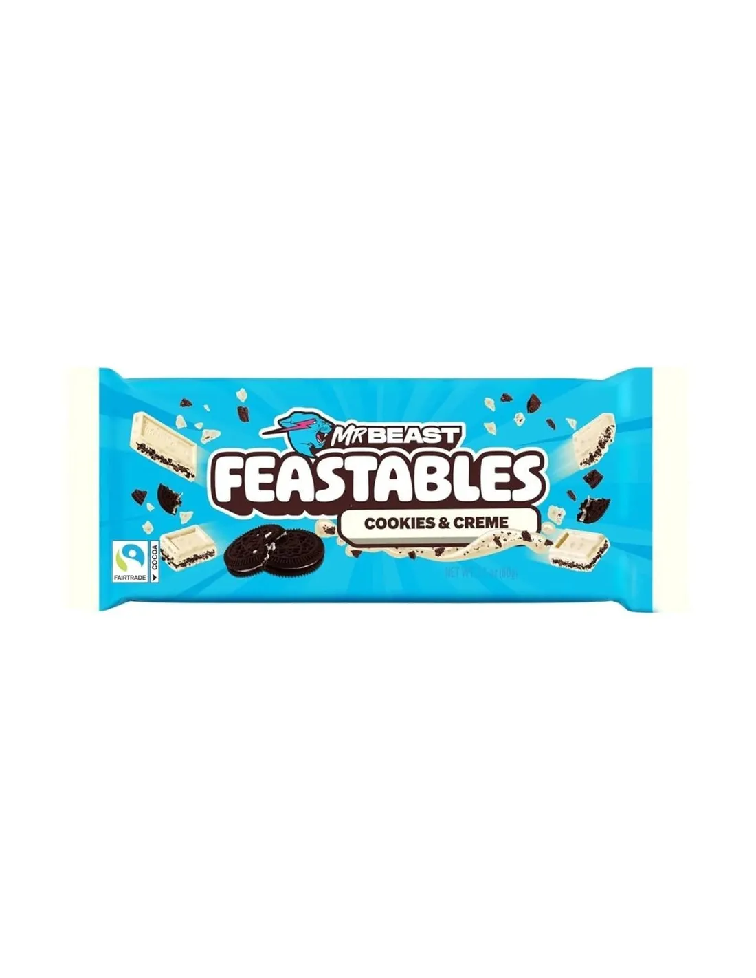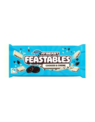 Descubre la barra de chocolate MRBEAST Feastables Cookie & Cream . El famoso youtuber estadounidense MrBeast lanza su propia marca de chocolate con una deliciosa receta que combina chocolate con leche y trozos de galleta de cacao .