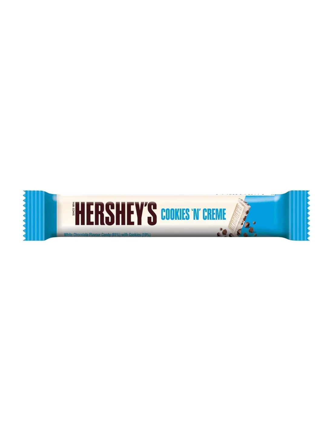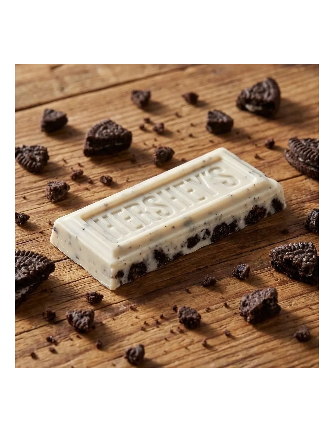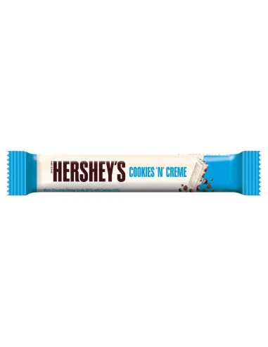 Acerca de Hershey's Cookies 'n' Creme : Lanzada en 1994 , la barra Hershey's Cookies 'n' Creme se convirtió rápidamente en una de las más populares de la gama Hershey's . Satisface la moda estadounidense por la combinación de galleta y crema, popularizada por el helado del mismo nombre. Hershey's , fundada en 1894 por Milton S. Hershey en Pensilvania, es el mayor fabricante de chocolate de Estados Unidos. Su tamaño mini te permite disfrutar de este éxito de ventas estadounidense como refrigerio, perfecto para saciar un antojo dulce sin remordimientos.