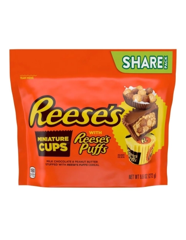 Las Miniaturas de Reese's con Reese's Puffs combinan dos iconos estadounidenses en un capricho irresistible: las legendarias tazas de chocolate con leche y mantequilla de cacahuete rellenas del famoso cereal Reese's Puffs . Una textura cremosa, crujiente y que se derrite en la boca gracias a los trozos de cereal entero. Sin gluten , con certificación kosher (OU-D) . Tamaño del envase: 272 g (aproximadamente 9,6 oz).