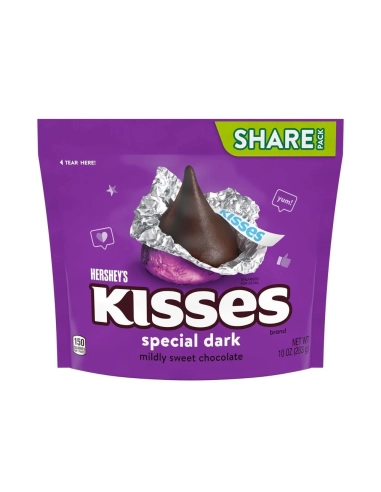 ¡Déjate seducir por los legendarios Hershey's Kisses Special Dark ! Descubre los famosos chocolates americanos con forma de lágrima en un generoso paquete para compartir . Envueltos en su hermoso papel de aluminio morado, ofrecen un delicioso chocolate negro de dulzura suave , ¡perfecto para satisfacer todos tus antojos de dulce!
