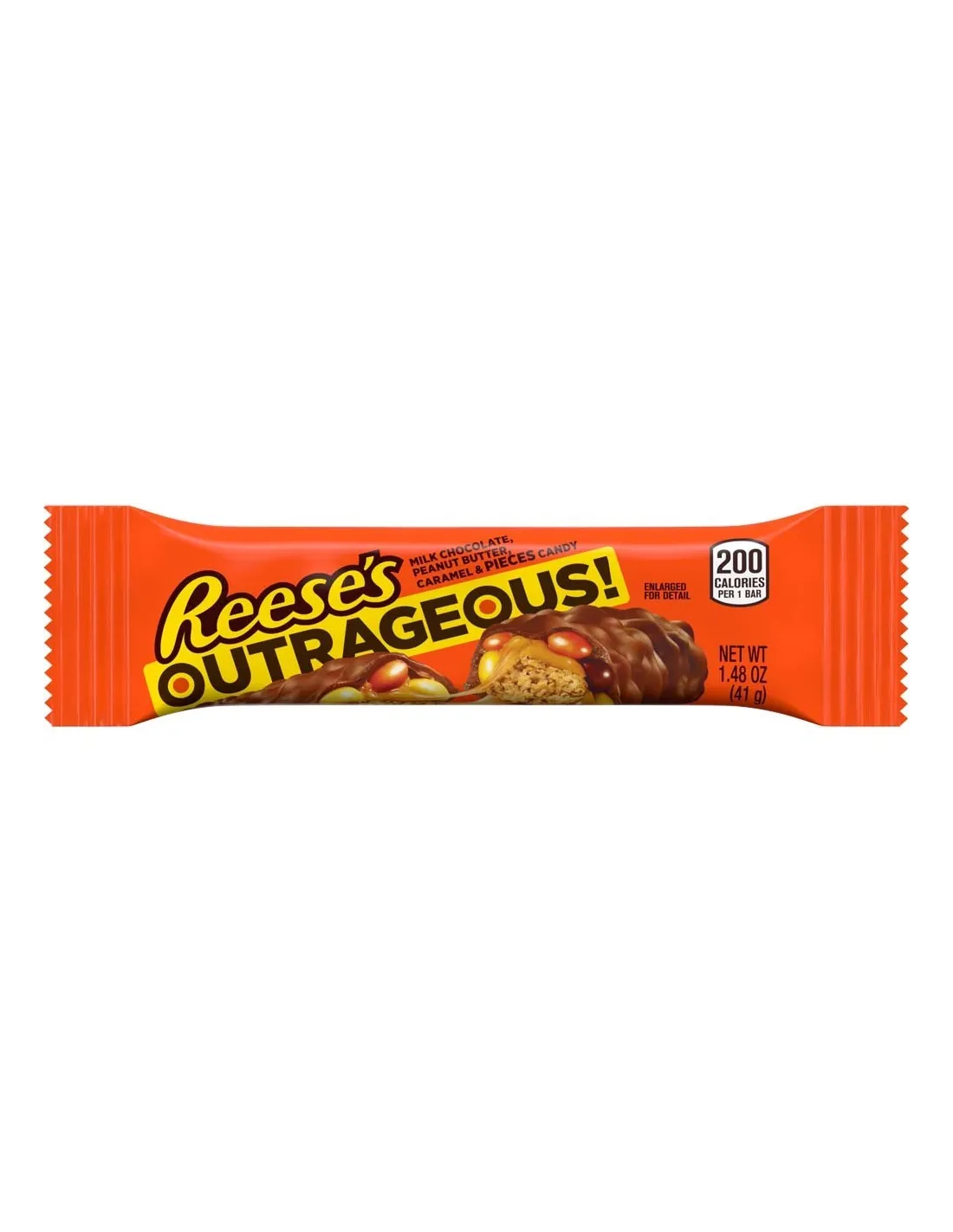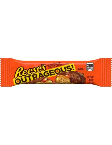 La barra Outrageous Peanut está cubierta con una capa de chocolate con leche, un corazón derretido y untuoso de caramelo, mantequilla de maní y mini Reese's Pieces , ¡para un placer escandalosamente gourmet!