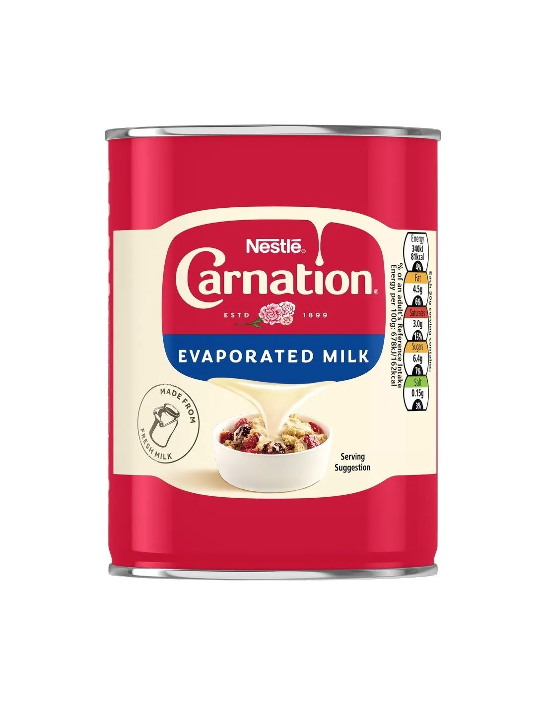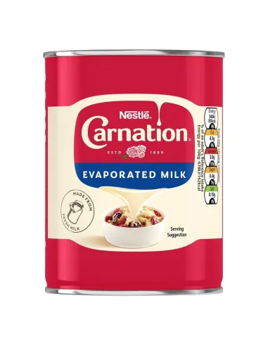 La Leche Evaporada Nestlé Carnation es una leche condensada sin azúcar con una textura rica y suave . Un ingrediente verdaderamente versátil que aporta cremosidad y suavidad a tus productos horneados , salsas , sopas y bebidas calientes . Lata de 410 g , un clásico estadounidense desde 1899.