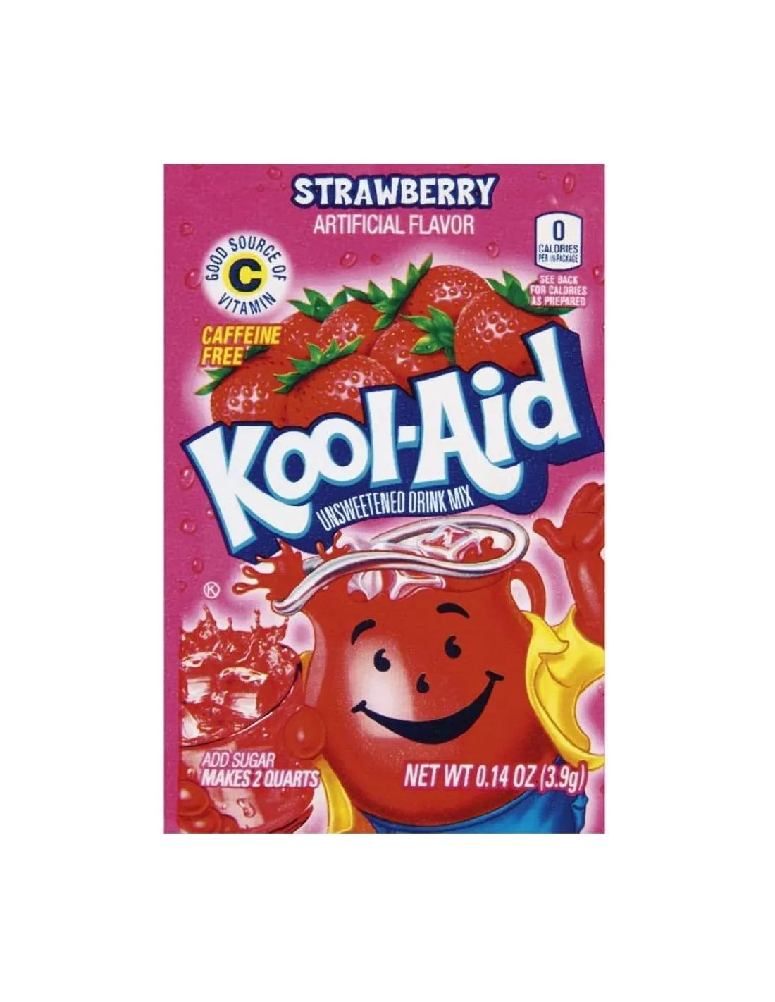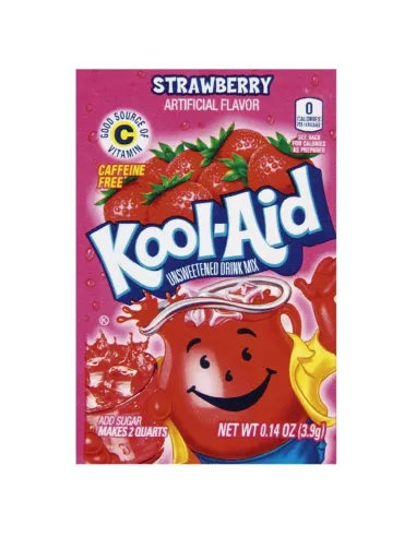 El sabor a fresa de Kool-Aid es el gran sabor de las fresas . Los paquetes de polvo de Kool-Aid son una fuente de vitamina C y no contienen cafeína. Todos los polvos de Kool-Aid no contienen azúcar . Puedes utilizarlo para diferentes bebidas, tanto como bebida para refrescarte como acompañante de tus cócteles.