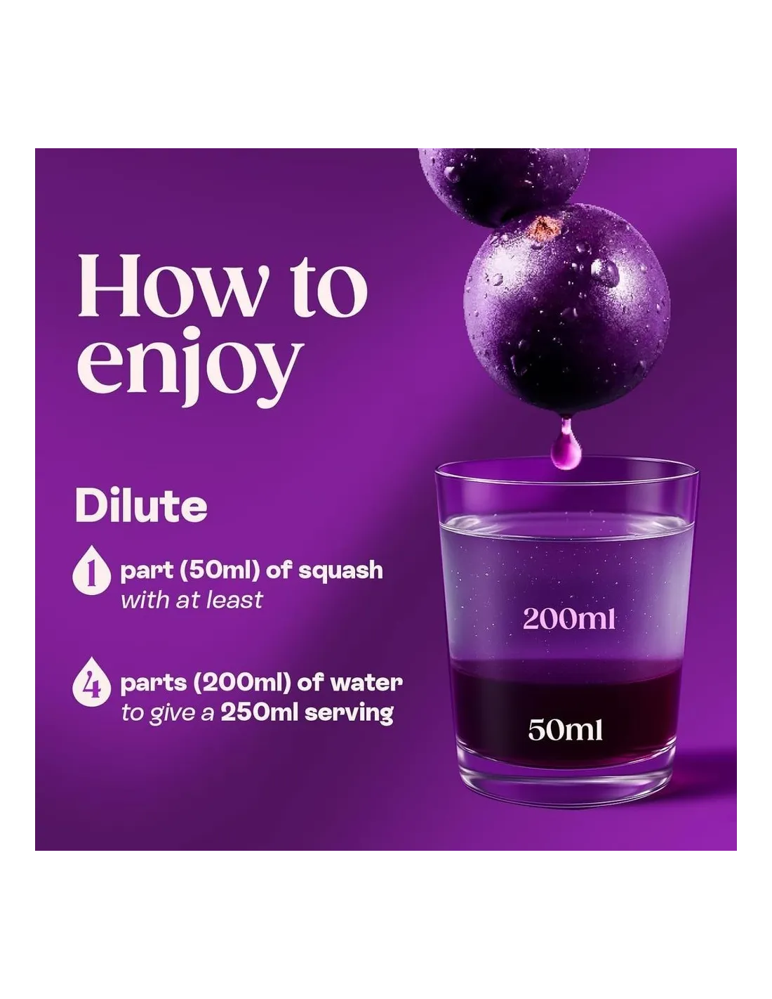 Ribena Sin Azúcares Añadidos se disfruta tradicionalmente diluido en agua fría (al menos 1 parte de sirope por 4 partes de agua), pero también se puede servir caliente en invierno. Perfecto para niños (añadir más agua para los más pequeños), adultos preocupados por su salud y cualquiera que quiera reducir su consumo de azúcar sin renunciar a sus bebidas favoritas. La botella de 850 ml rinde aproximadamente 17 raciones .