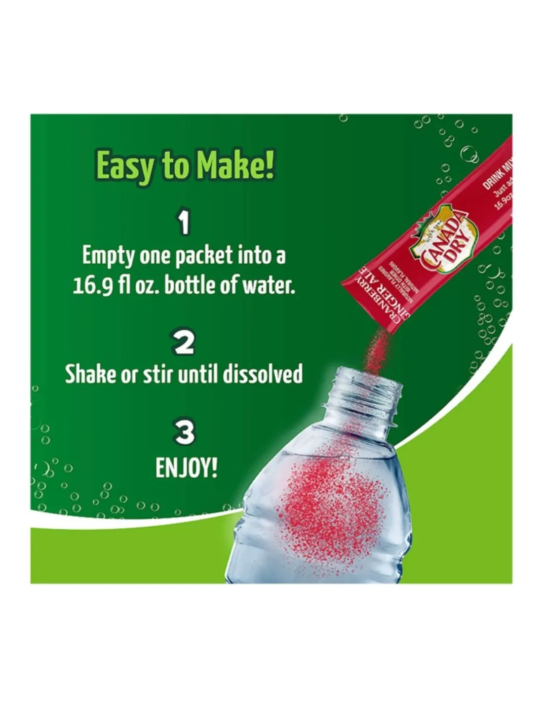 Es instantáneo: toma tu botella de agua o una botella de 500 ml, abre uno de los sobres individuales, vierte el polvo dentro, agita enérgicamente, ¡y listo! El truco 100% americano: mezcla este polvo con agua con gas bien fría para recrear a la perfección la ilusión de un auténtico refresco Canada Dry.