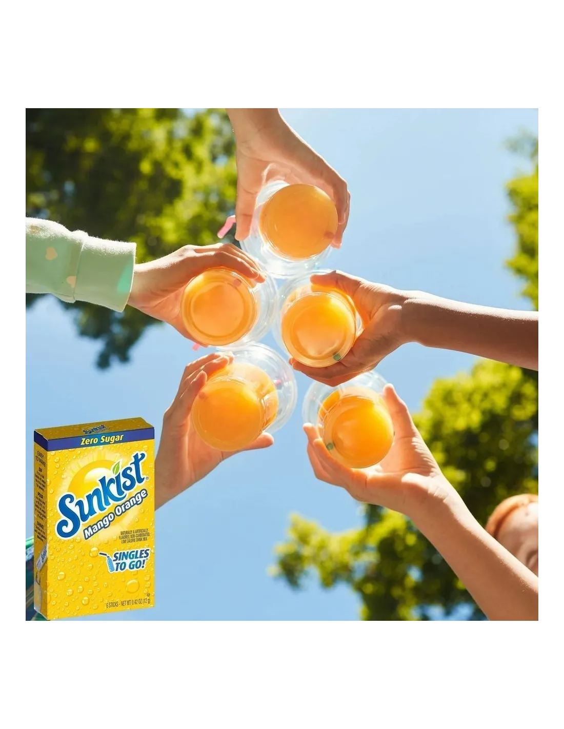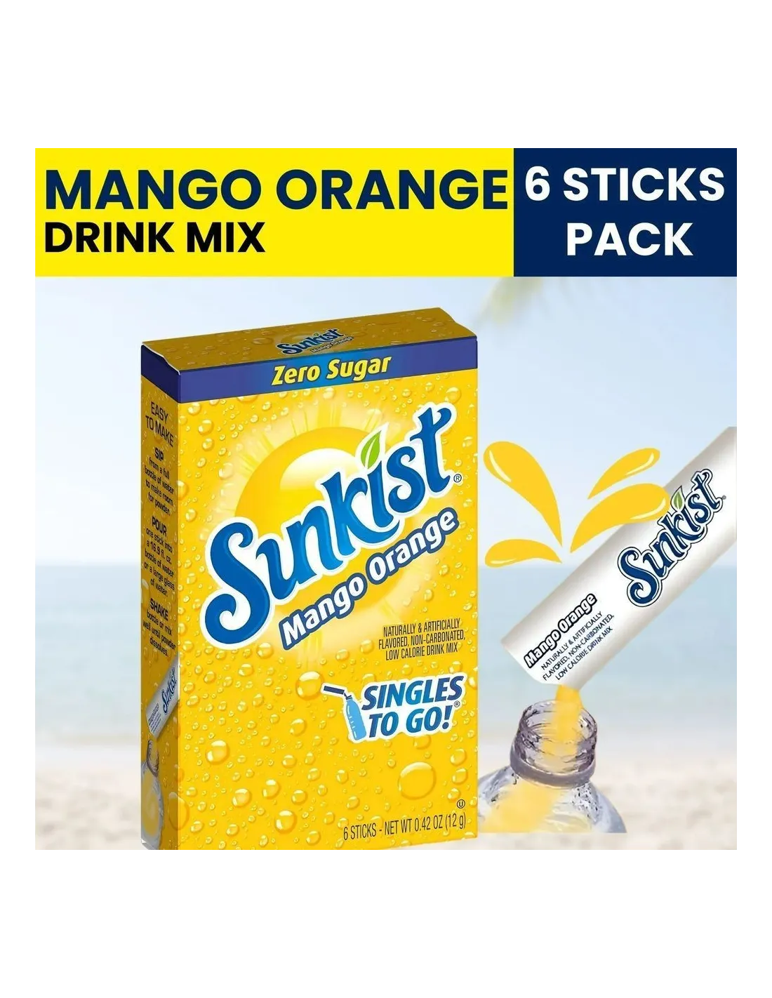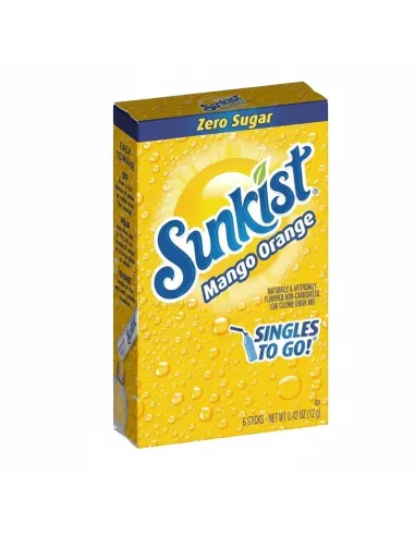 Sunkist Singles To Go Orange Peach Mango ofrece una refrescante mezcla tropical enriquecida con vitamina C. La composición incluye ácido cítrico, ácido ascórbico (vitamina C), sabores naturales, citrato de sodio, menos del 2% de sucralosa, acesulfamo de potasio, óxido de magnesio y colorantes artificiales amarillo 6, amarillo 5 y rojo 40. El perfil de sabor combina la frescura ácida de la naranja , la dulzura aterciopelada del melocotón y las notas dulces y exóticas del mango para un equilibrio afrutado que calma perfectamente la sed.