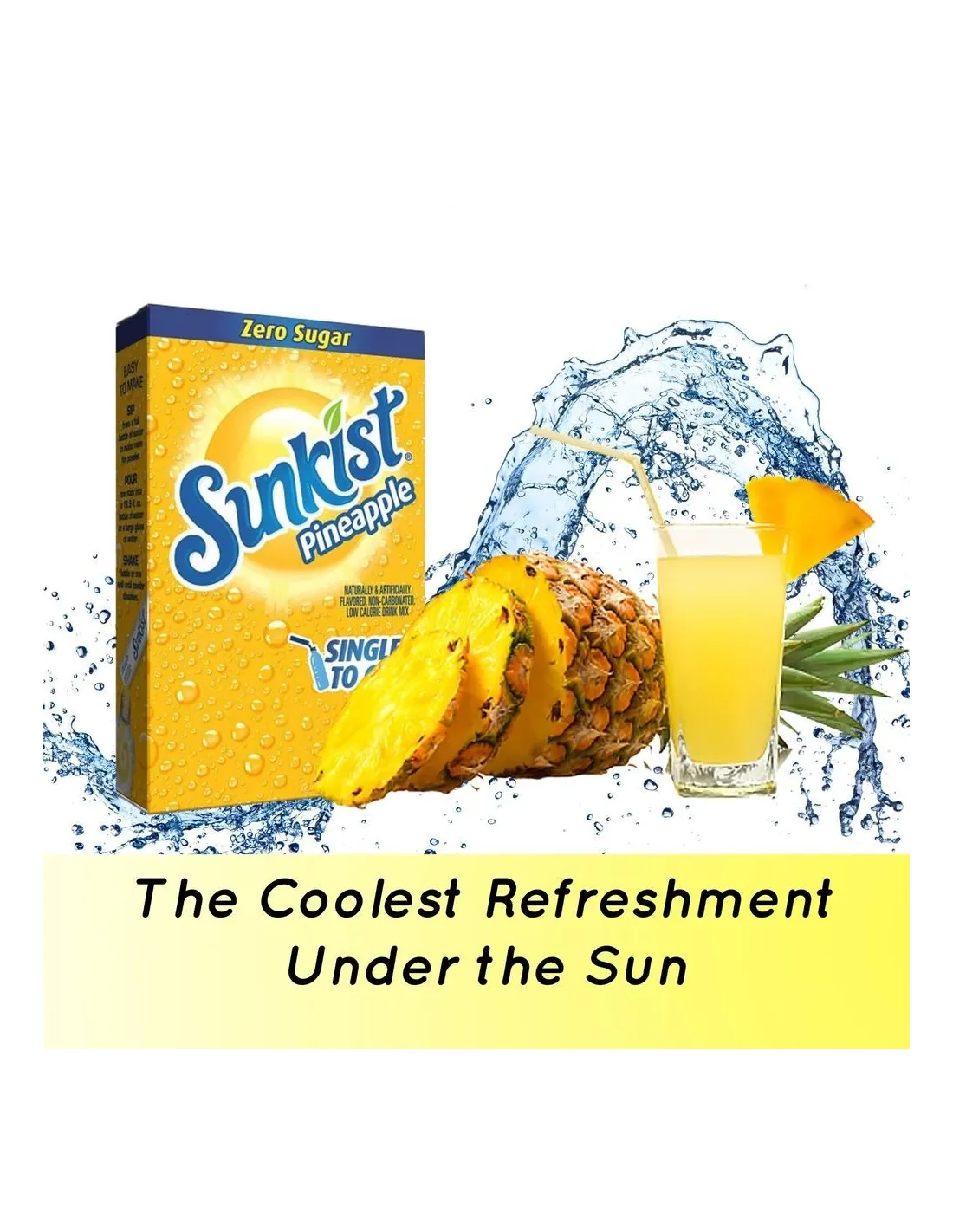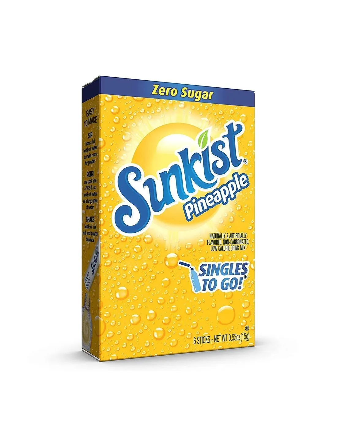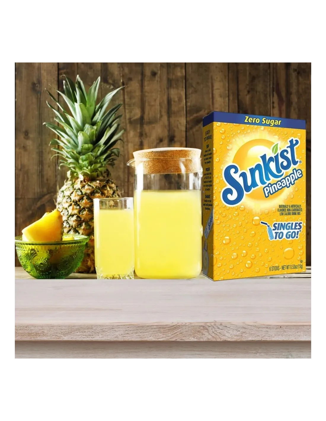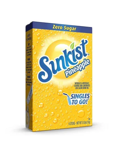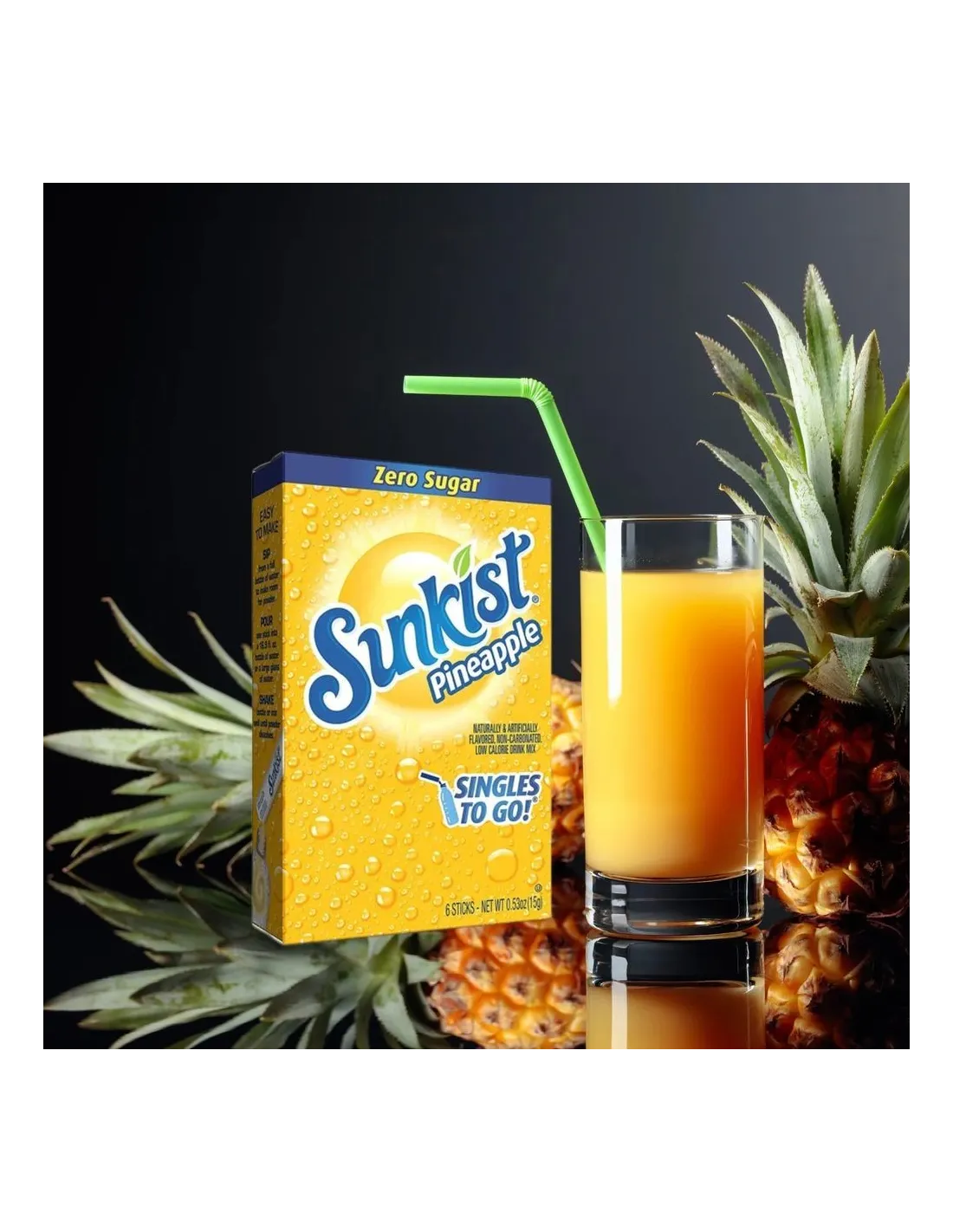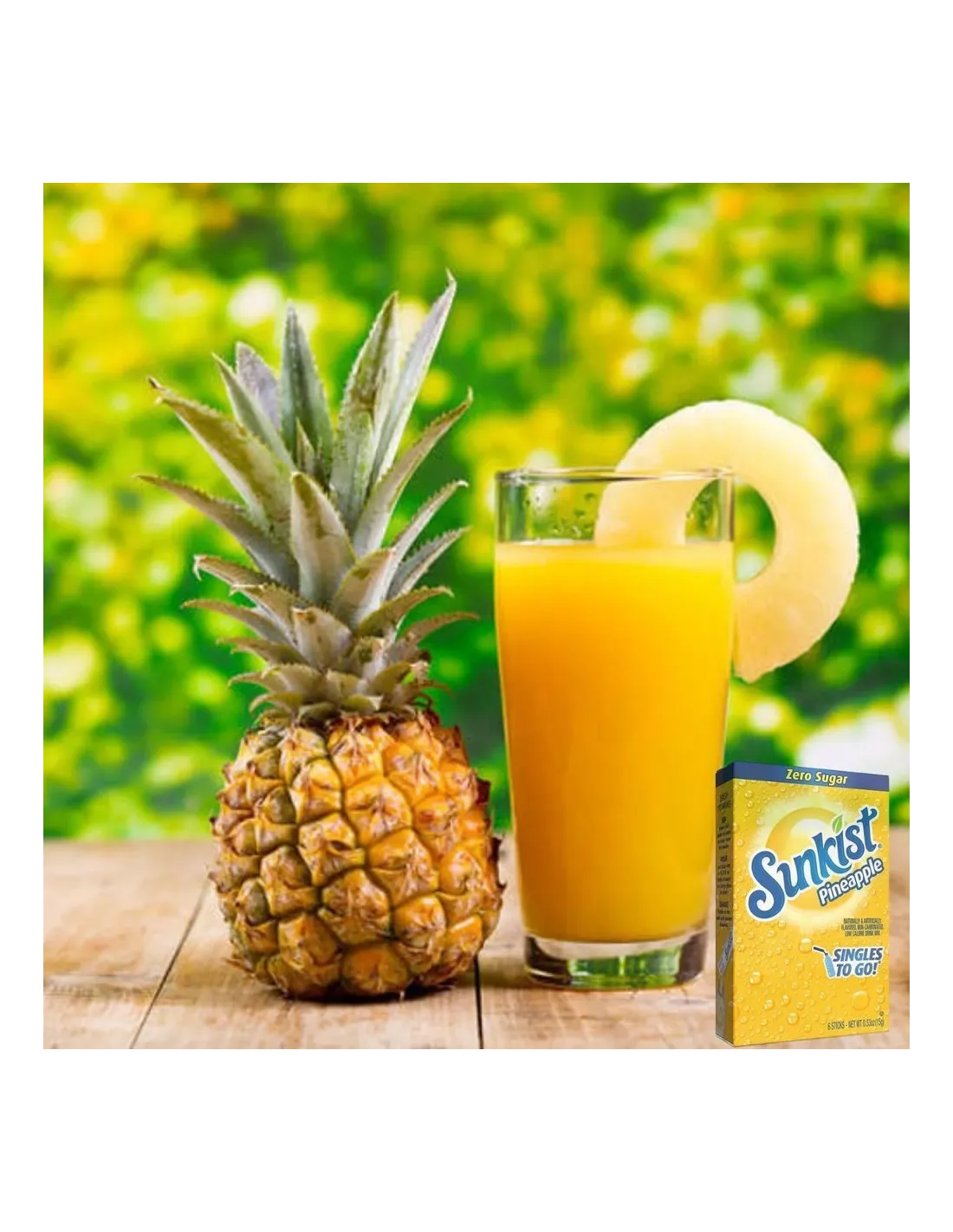 ¡Viaja al trópico con cada sorbo de Sunkist Singles To Go Piña ! Si bien la marca estadounidense Sunkist es la reina indiscutible de los cítricos, también domina a la perfección los sabores exóticos, como lo demuestra esta deliciosa versión de piña que es todo un éxito en Estados Unidos.