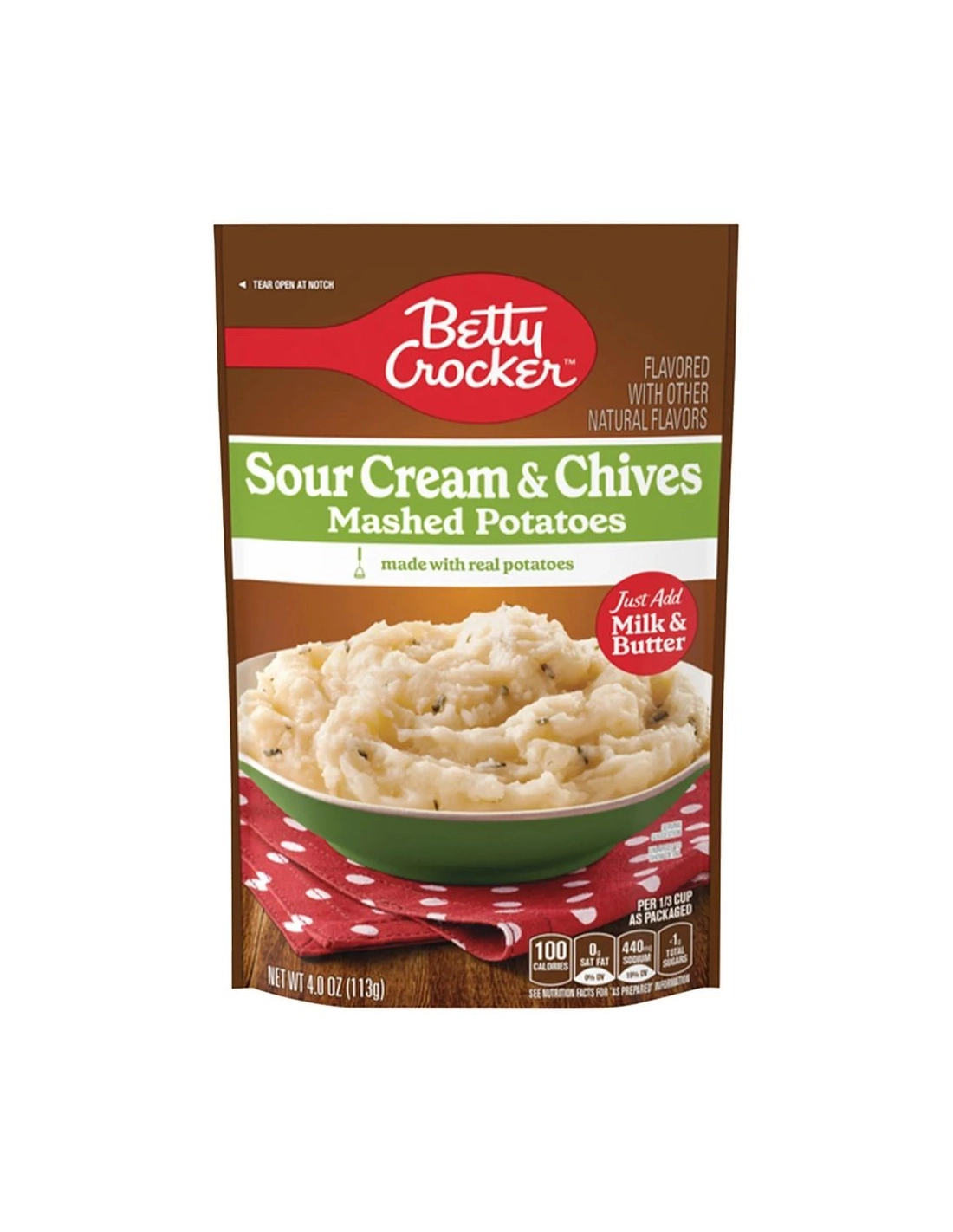 ¡Ahorra tiempo en la cocina sin sacrificar el sabor con el delicioso puré de papas con crema agria y cebollino de Betty Crocker ! El puré de papas de la marca Betty Crocker es muy popular en los hogares estadounidenses por su auténtica textura casera y sus ricos y sabrosos condimentos.