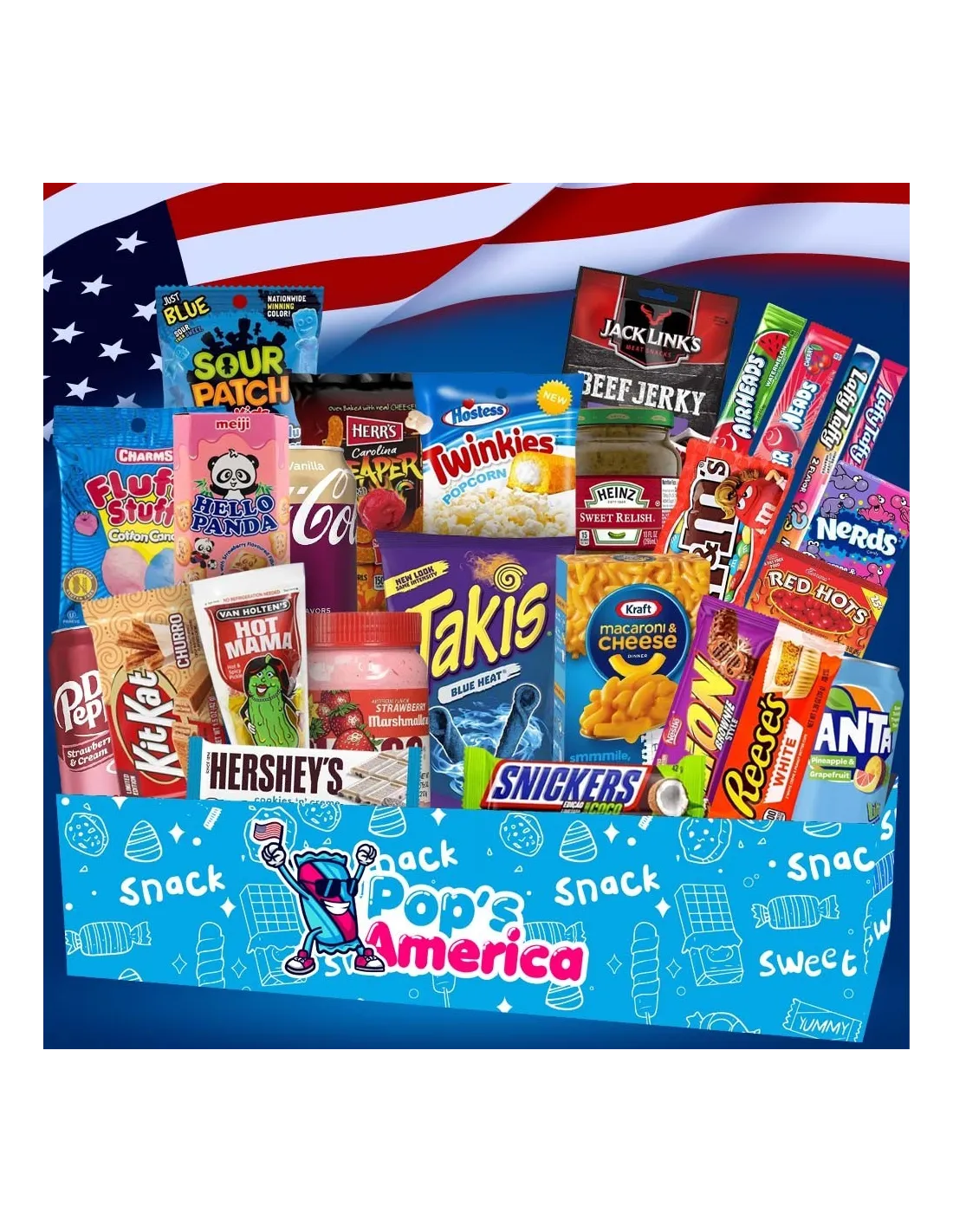 26 productos de las marcas estadounidenses más importantes están presentes en la caja: Hershey's, Reese's, Mountain Dew, Airheads, Charms, Wonka, Fanta, Jack Link's y muchos otros.