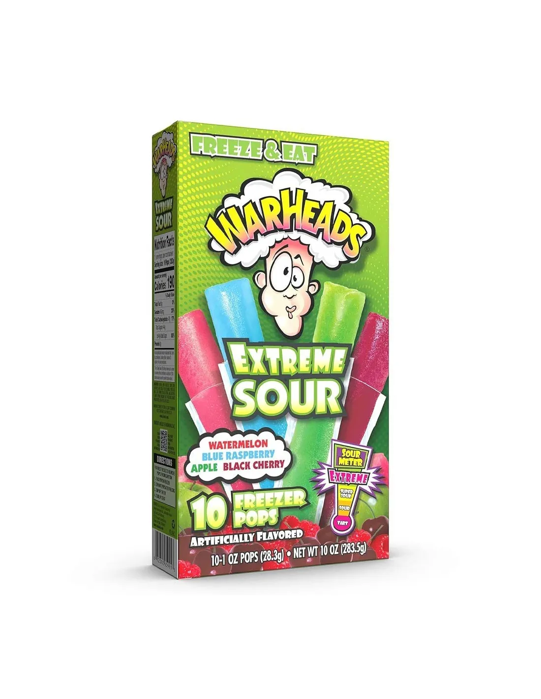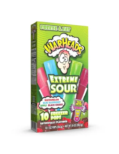 Echa un vistazo a las paletas heladas Warheads Extreme Sour Freezer Pops para el congelador. Si conoces los caramelos Warheads, te encantará el lado ácido de estos helados con un buen sabor a sandía, frambuesa azul, manzana verde y guinda. ¡Los famosos Sour Meter Warheads los clasificaron al máximo! ¿Listo para hacer una cara?