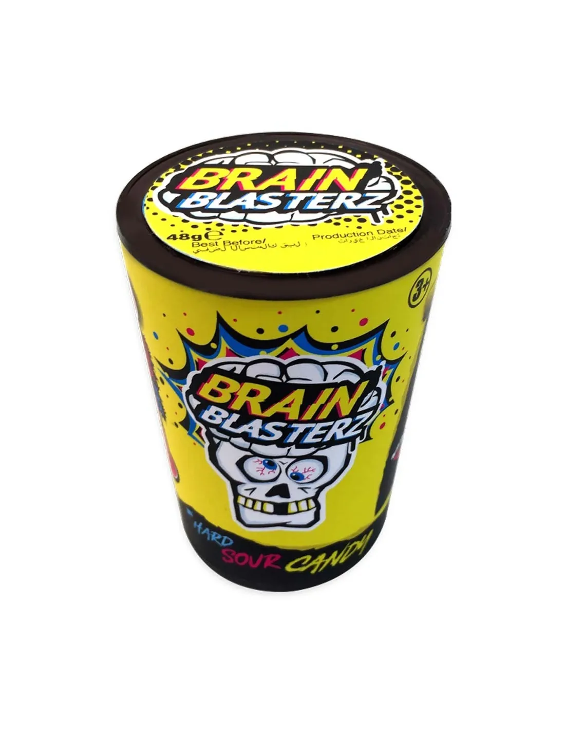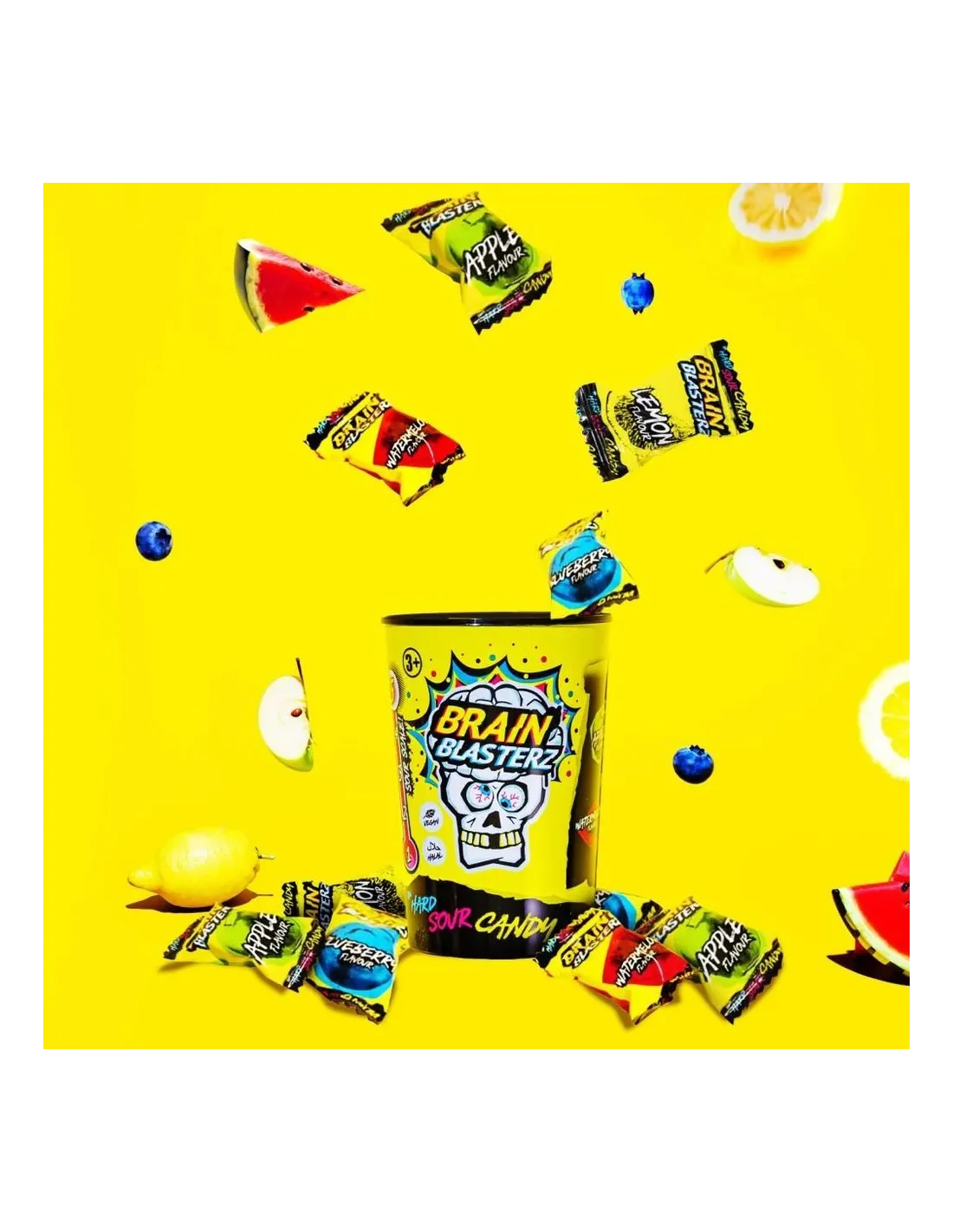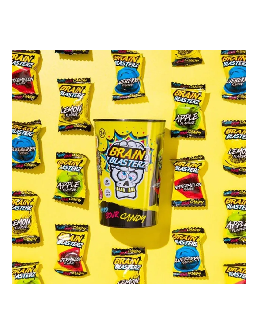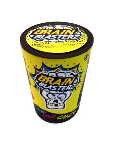 La marca Brain Blasterz existe desde 2011 y ofrece una amplia gama de caramelos ácidos. Brain Blasterz Super Sour Candy son pequeños caramelos duros cubiertos de un polvo muy picante. Cada caja pesa 48 gy contiene varios caramelos envueltos individualmente. 4 sabores originales disponibles en cada caja: