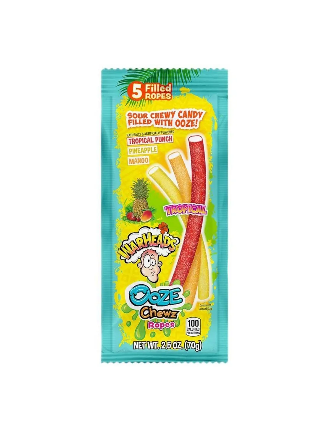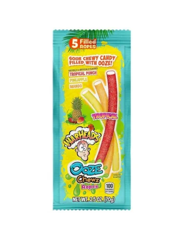 Los Warheads Ooze Chewz Ropes Tropical ofrecen una experiencia de doble textura: una capa exterior suave y afrutada con un centro ácido y fluido. Esta combinación crea un contraste inmediato entre la dulzura tropical y la intensidad ácida. Los sabores suelen incluir aromas a mango, piña, maracuyá o ponche tropical, cada uno con una acidez pronunciada y un perfil afrutado expresivo.