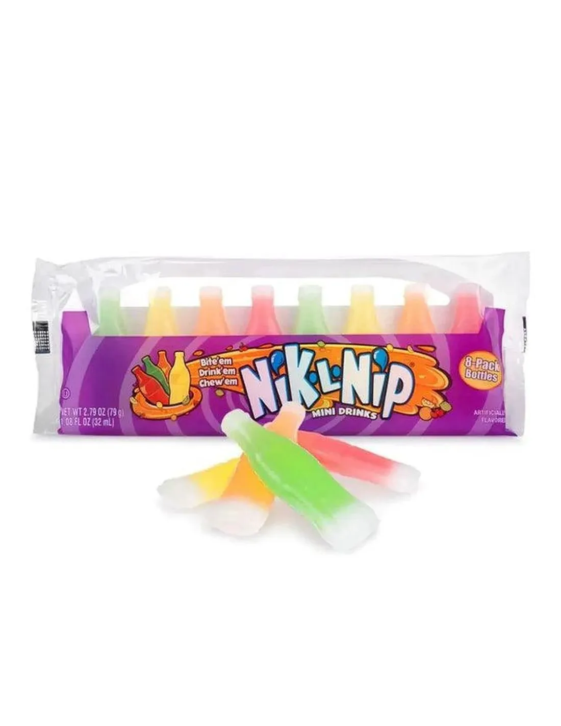 Una tendencia popular en TikTok , las Mini Nik-L-Nip son pequeñas botellas de cera que, al morder la tapa, desprenden un delicioso jarabe afrutado. Se venden en paquetes de 8 con 4 sabores diferentes (cereza, naranja, limón y frambuesa azul). Esta versión es ácida.