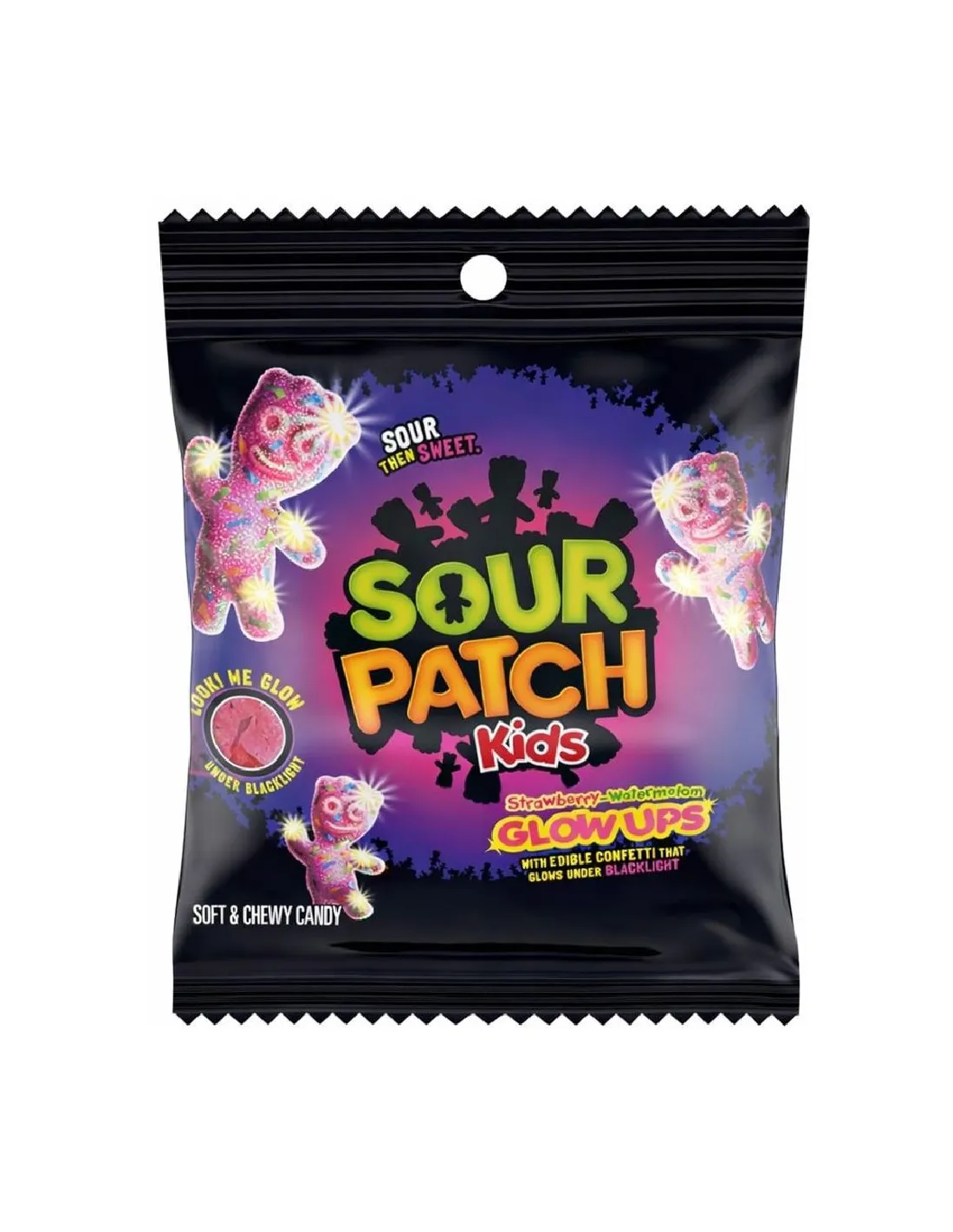 ¡Sumérgete en el divertido y peculiar mundo de Sour Patch Kids Glow Ups Fresa-Sandía! Estas gomitas con intensos sabores a fresa y sandía combinan el icónico sabor ácido de la marca con un toque de magia visual: brillan bajo la luz negra gracias a un pequeño confeti comestible integrado en su recubrimiento.