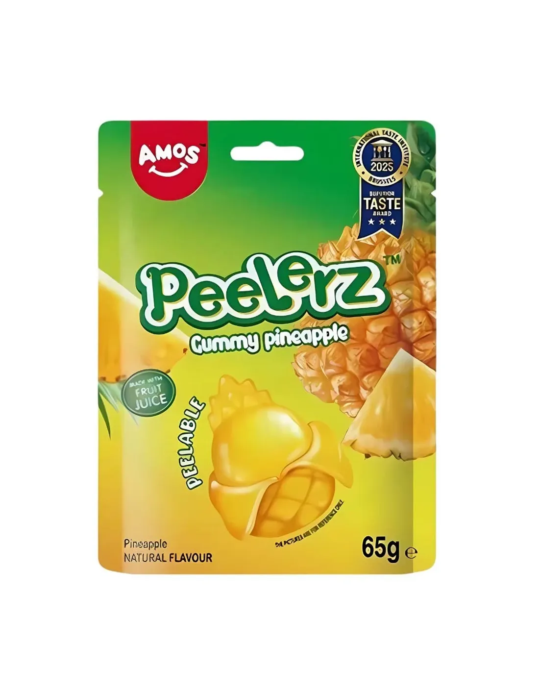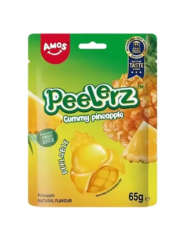 ¡Descubre las gomitas de piña Amos Peelerz rellenas de auténtico jugo de piña! Su singular forma de minipiña y su intenso sabor eclipsan por completo a los tradicionales aros de plátano.