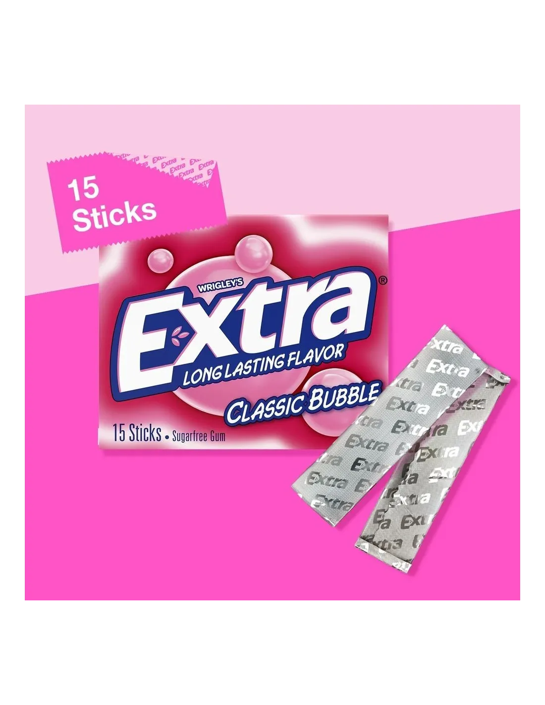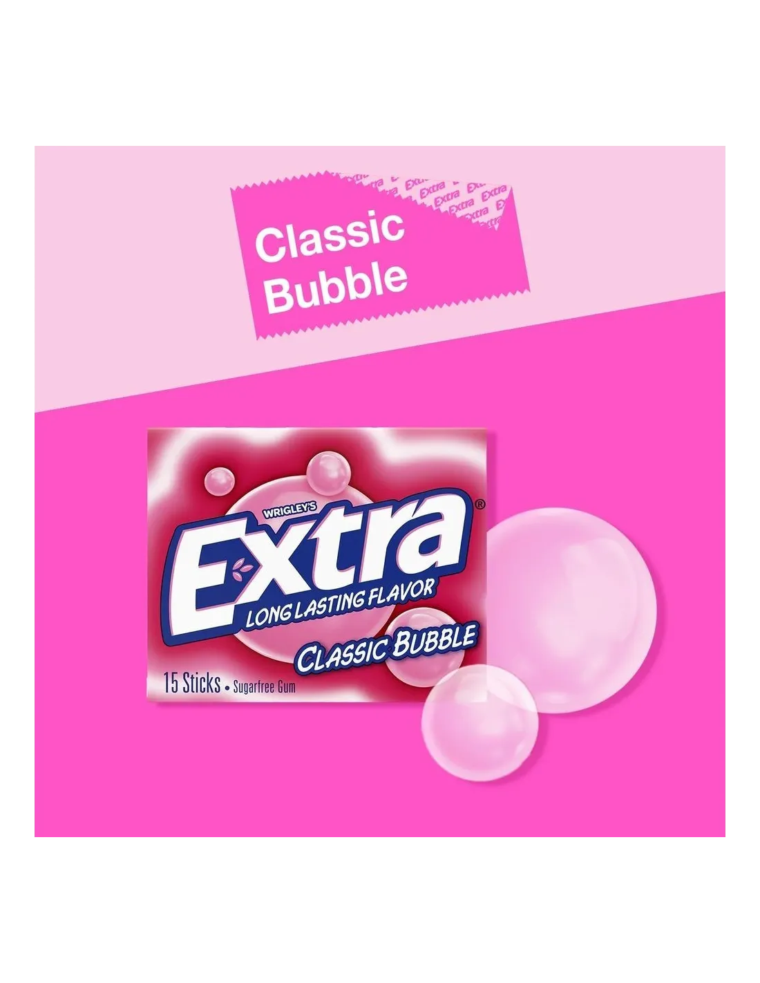 Extra Gum Classic Bubble es un homenaje directo al clásico chicle que ha cautivado a generaciones. Con su icónico sabor rosa, dulce y nostálgico, este chicle estadounidense ofrece un verdadero viaje al mundo de los snacks de la cultura pop, desde ferias y parques de atracciones hasta los sabores de la infancia.
