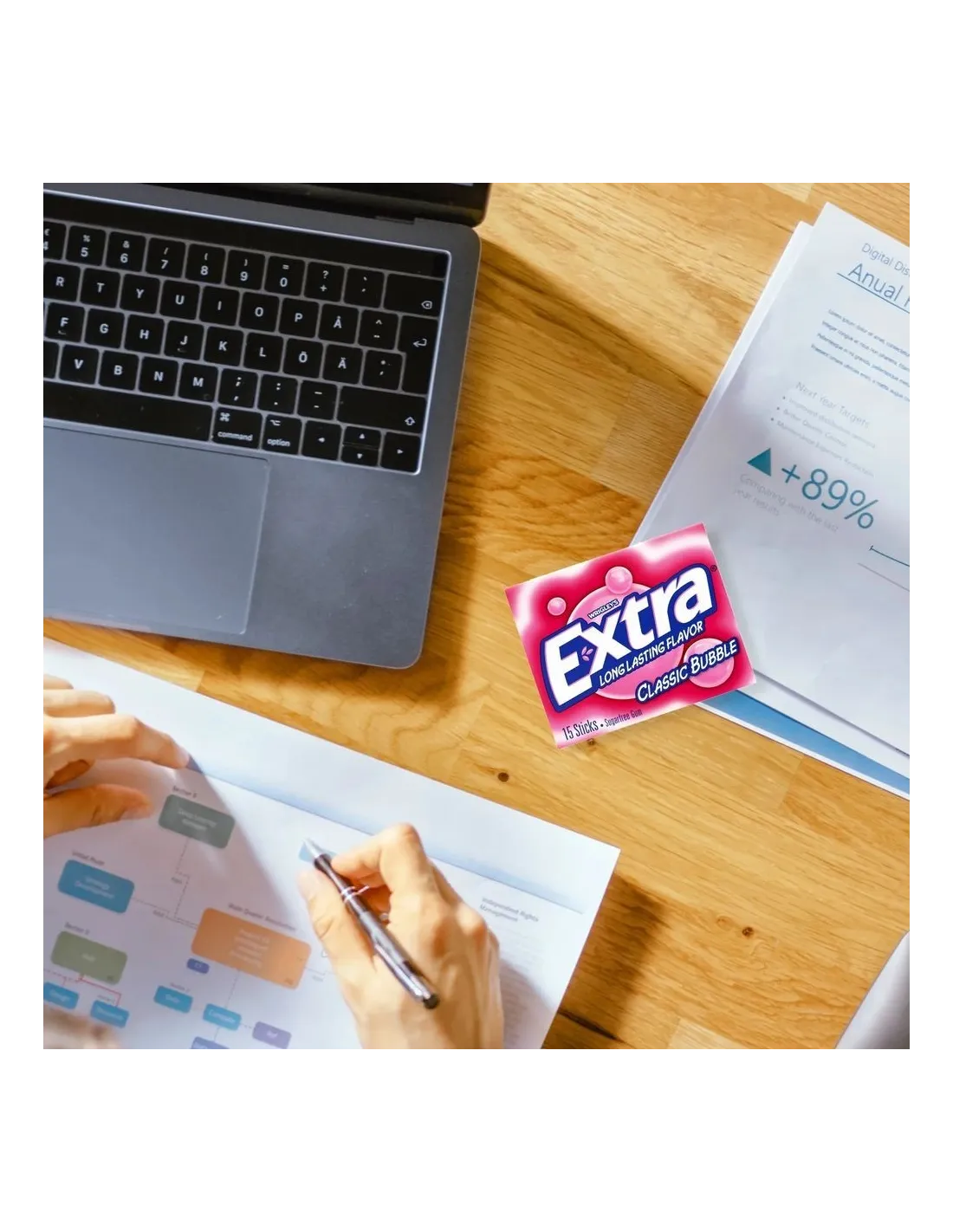 Desde el primer mordisco, el sabor a chicle explota en la boca: una mezcla de dulzor afrutado, notas de vainilla y aromas retro característicos del auténtico chicle americano. Su textura es suave, agradable al masticar y está diseñada para ofrecer una frescura duradera , fiel a la reputación de la marca Extra.