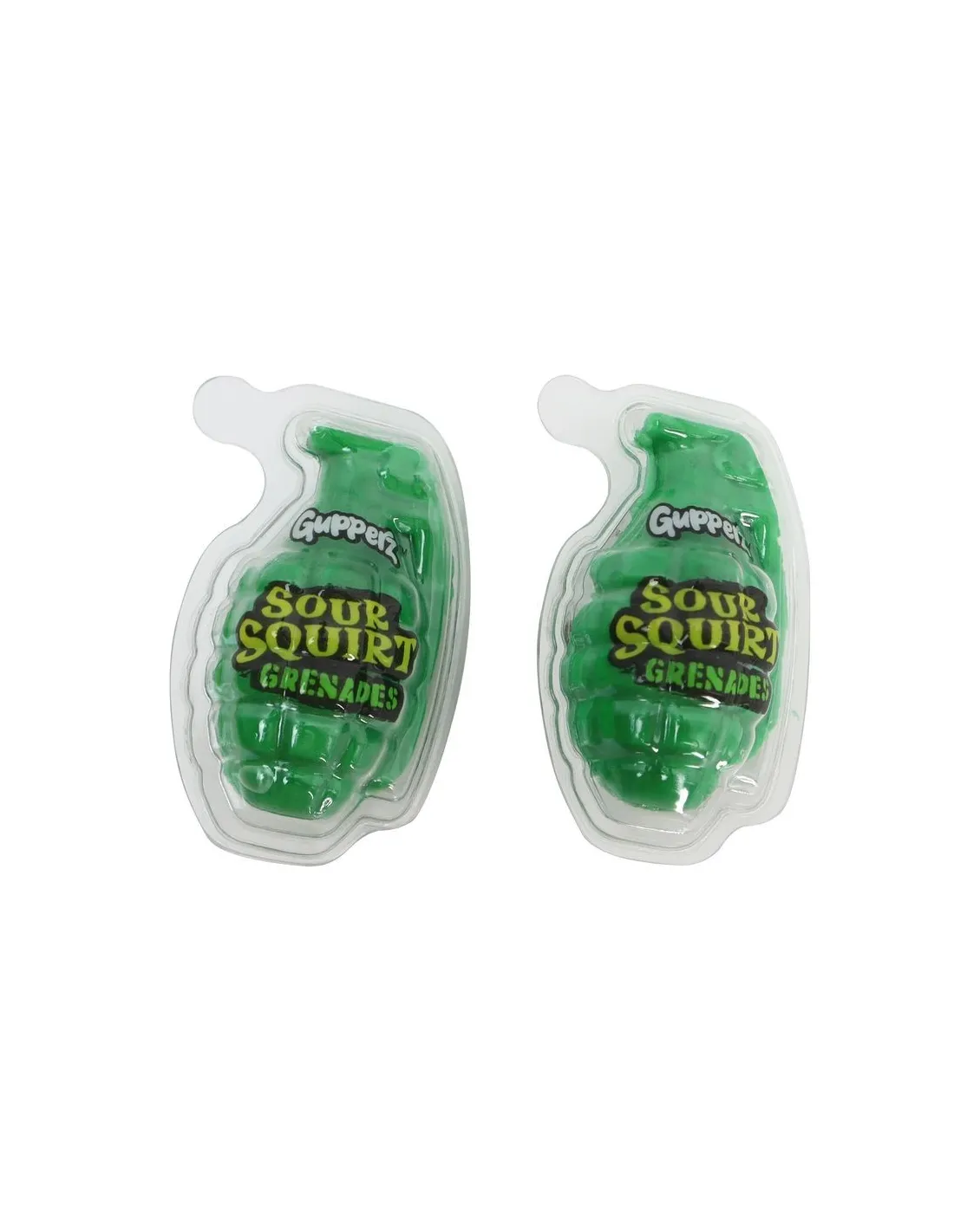 ¡Las granadas ácidas Gupperz Sour Squirt son una verdadera arma de sabor explosivo ! Estas gomitas tienen forma de granada en miniatura y esconden un centro líquido súper ácido .