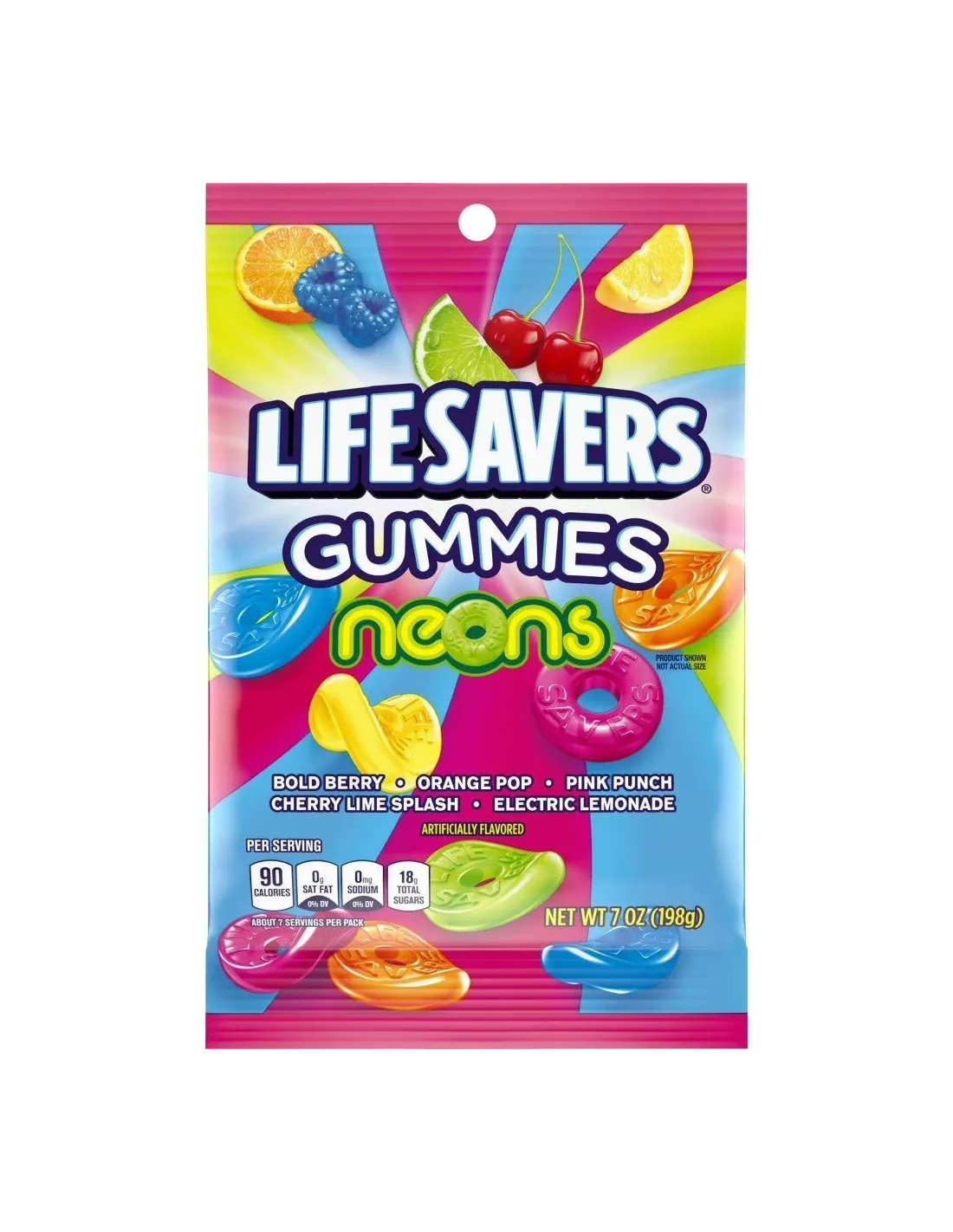 Las Gomitas Neon Lifesavers son gomitas de colores brillantes con intensos sabores frutales. Su textura masticable y su sabor intenso las convierten en un capricho divertido y fácil de comer.