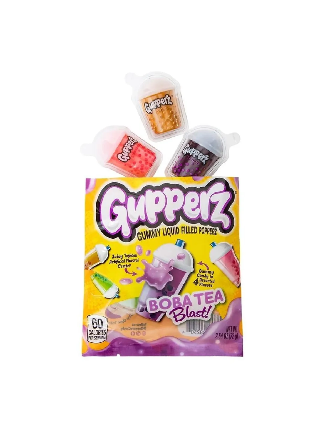 La marca Gupperz se especializa en "Gomitas Popperz Rellenas de Líquido", gomitas con rellenos originales y creativos. Su gama también incluye sabores atrevidos como Poppin' Pickle, Sour Squirt Grenade, Confetti Cakesplosion, Chocolate Milkano y Strawberry Milk Splash. Cada variedad viene en un envase con la forma de su inspiración: en este caso, una adorable taza de boba decorada con perlas de tapioca. Boba Tea Blast se suma a la tendencia mundial del té de burbujas, una bebida taiwanesa inventada en la década de 1980 que ha conquistado el mundo. Bolsa de 72 g (2.54 oz).