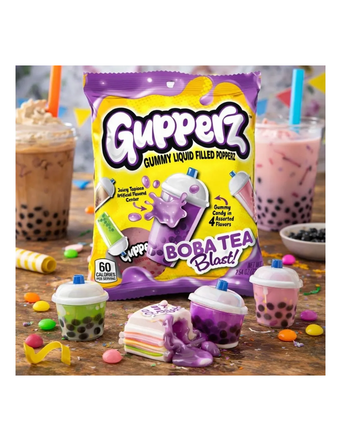 Gupperz Boba Tea Blast transforma la experiencia del té de burbujas en innovadoras gomitas. Cada gomita con forma de taza de boba contiene un líquido en el centro que explota en la boca, liberando auténticos sabores a vainilla, té con leche, matcha y fresa . Una sensación única que encantará a los amantes del té de burbujas y la repostería creativa.